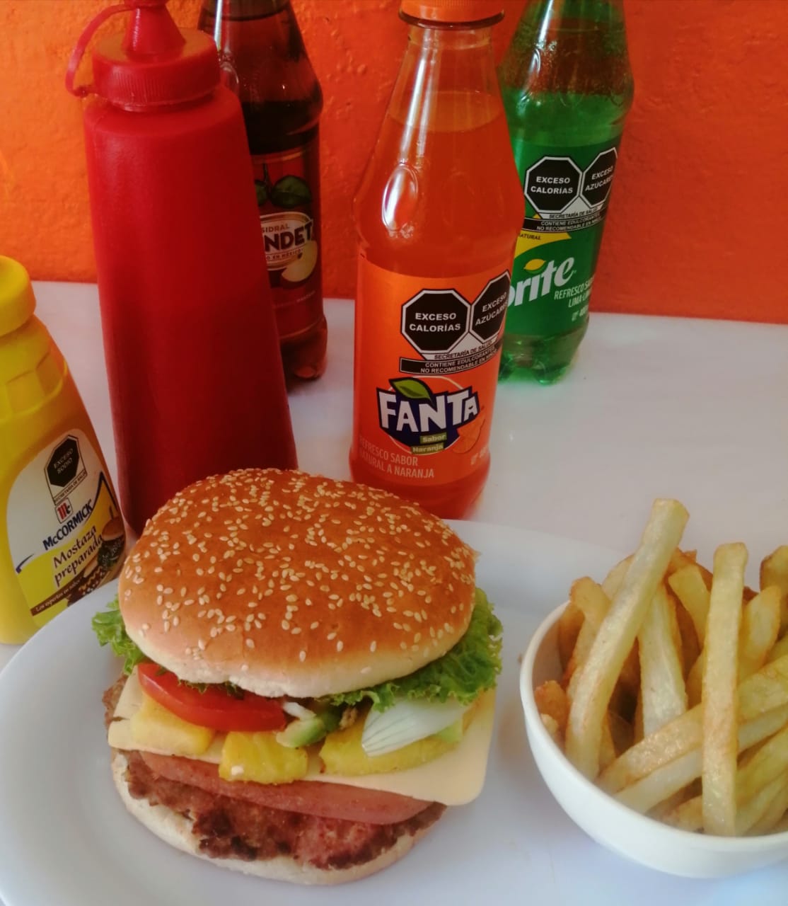 Catzup, queso amarillo , salsa valentina