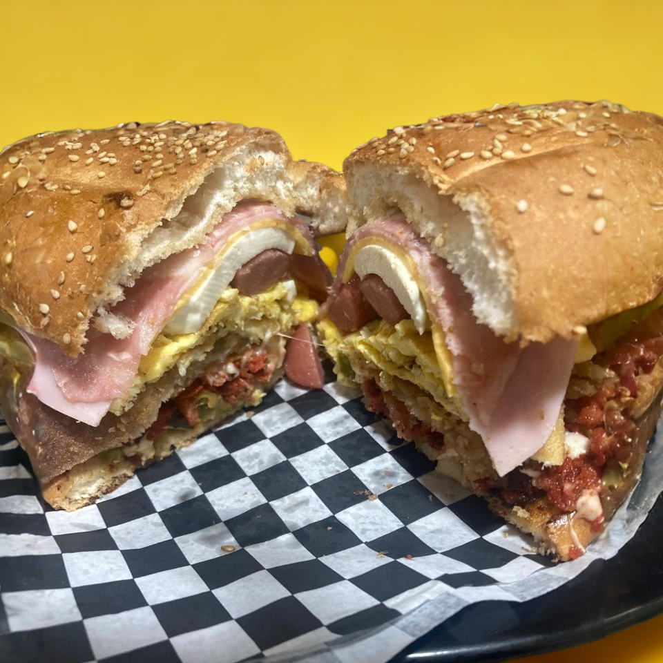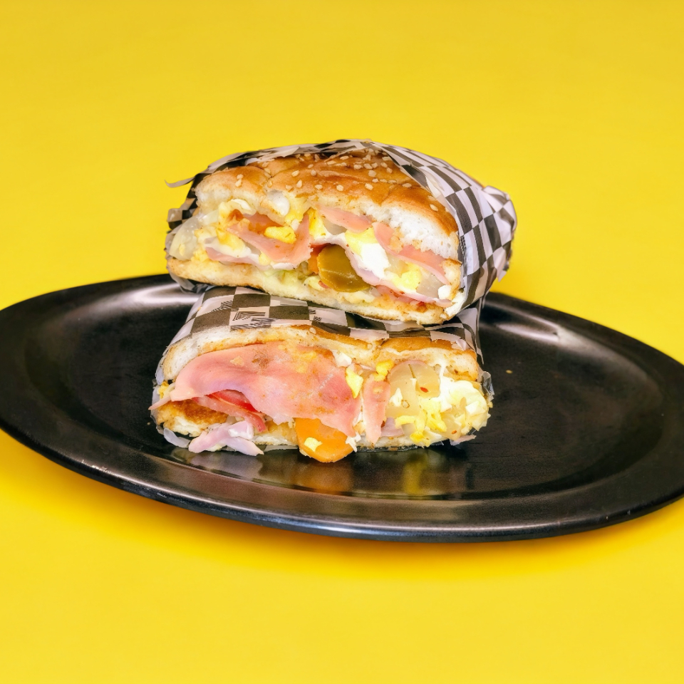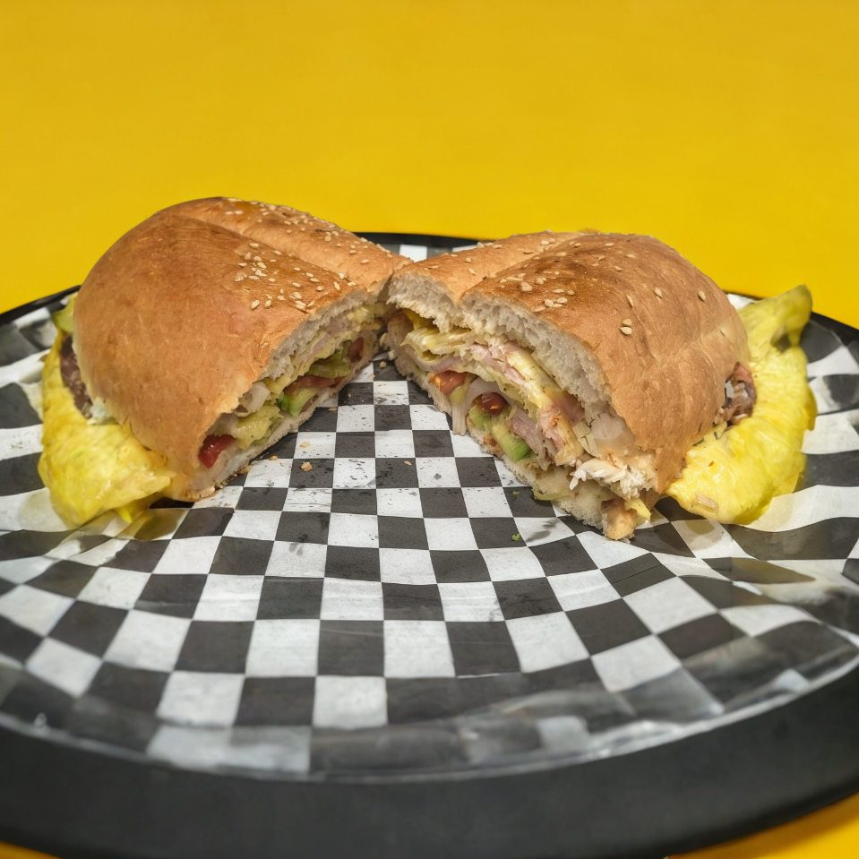 Jamon, quesillo, q. amarillo, mayonesa, jitomate, cebolla, aguacate y picante.