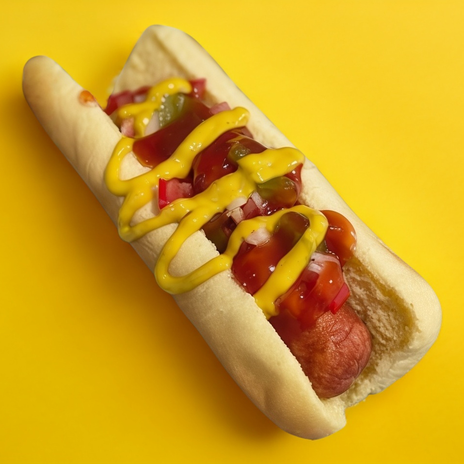 Salchicha, jitomate, cebolla, picante, mayonesa, catsup y mostaza.