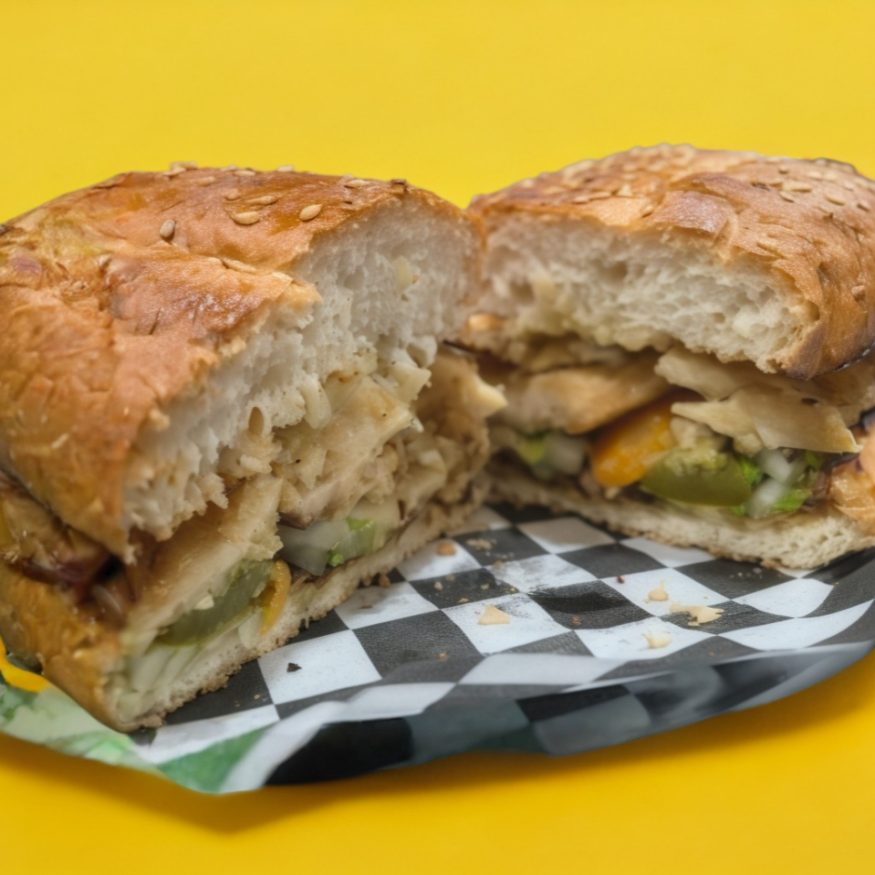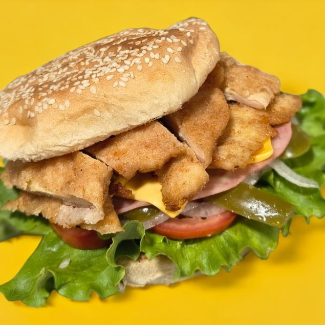 Pan para hamburguesa (bollos) Pechuga de pollo empanizada, jamon, queso oaxaca, queso amarillo, mayonesa, lechugas, jitomate, cebolla y picante.