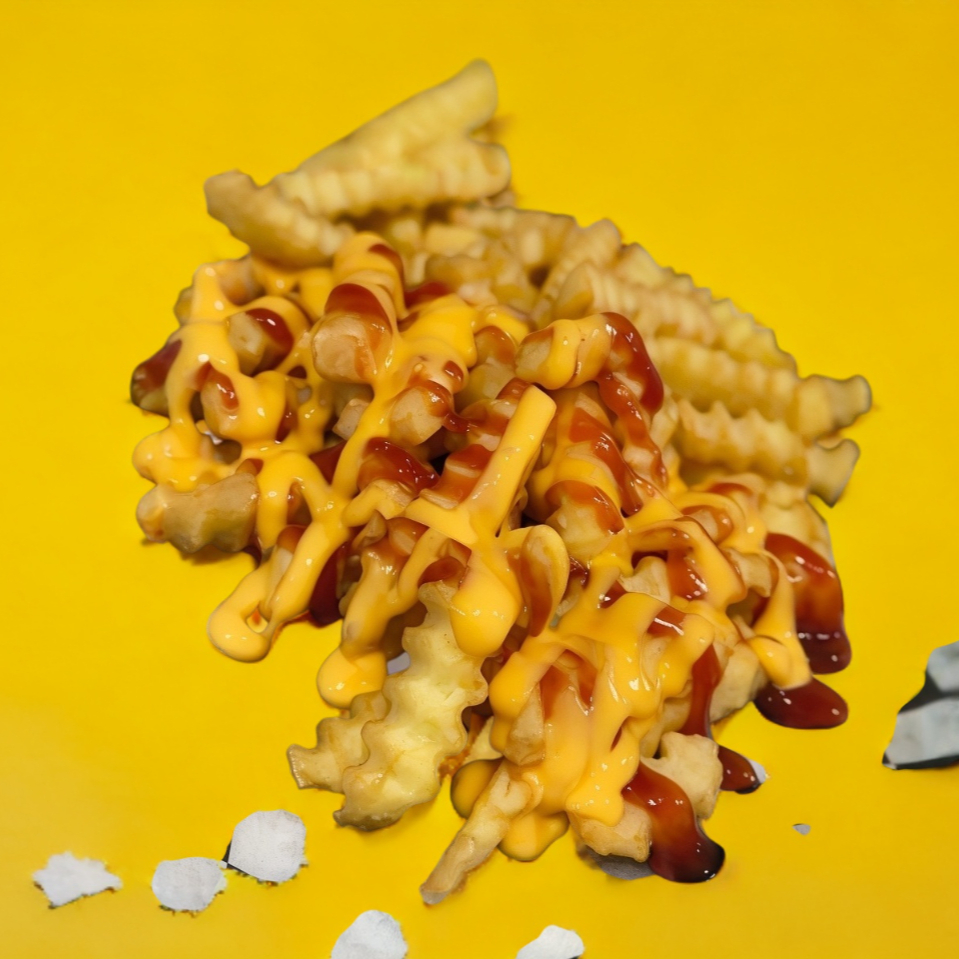 Salchichas fritas, catsup queso amarillo líquido y salsa.