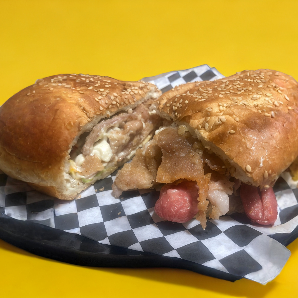 Milanesa, salchicha, quesillo, mayonesa, aguacate, jitomate, cebolla y picante.