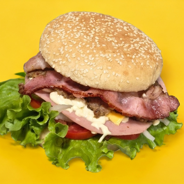 Dos carnes, jamon, quesillo, q. amarillo, lechuga, jitomate, cebolla, picante, catsup y mostaza.