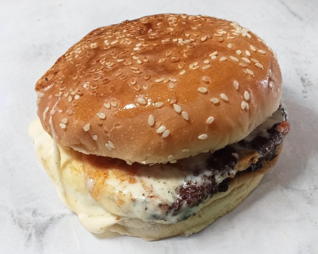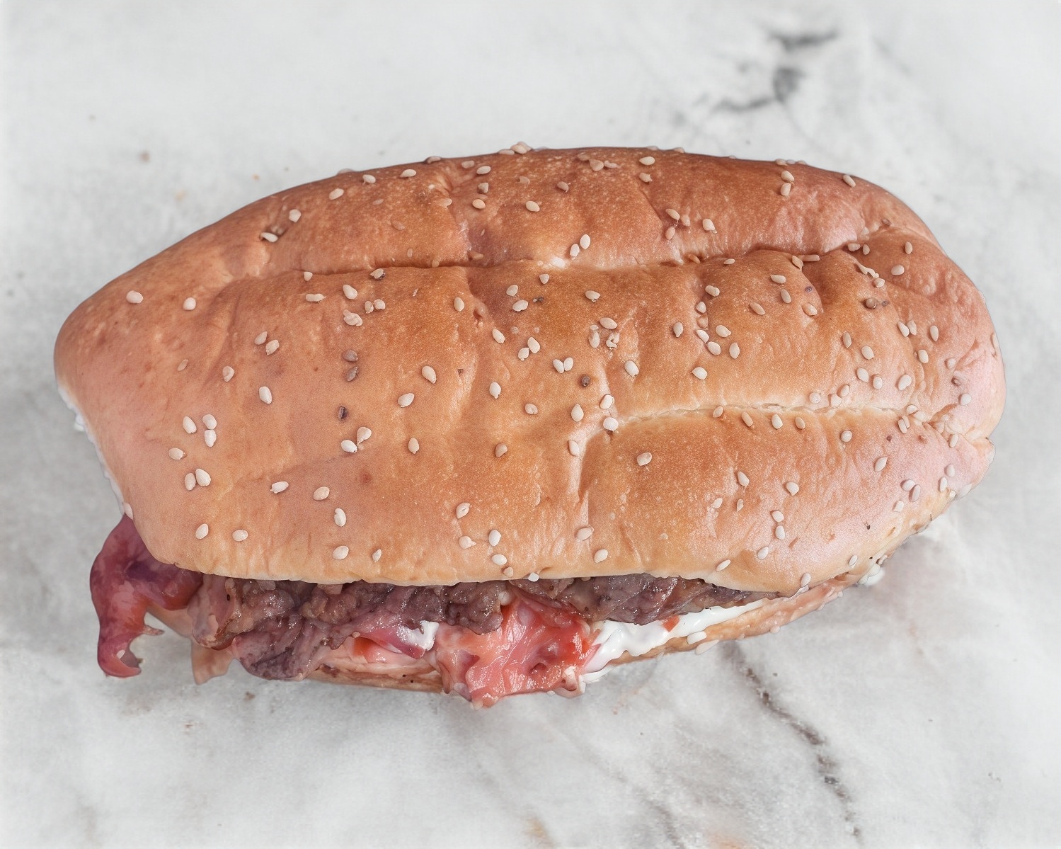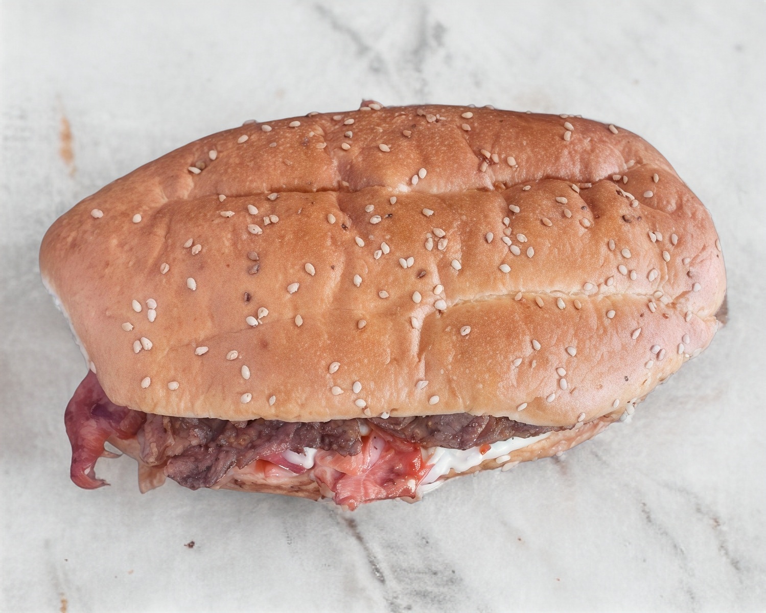 Pan bimbo de hamburguesa, deliciosa carne arrachera 90 gramos aprox, jitomate, queso huajaca, cebolla, salsa catsup, mayonesa y mostaza.