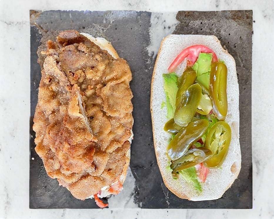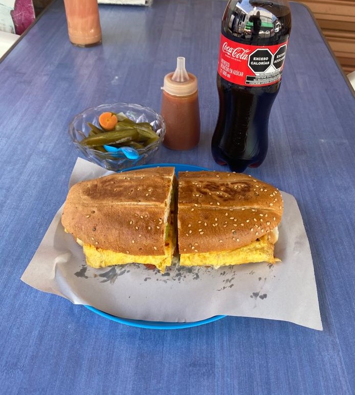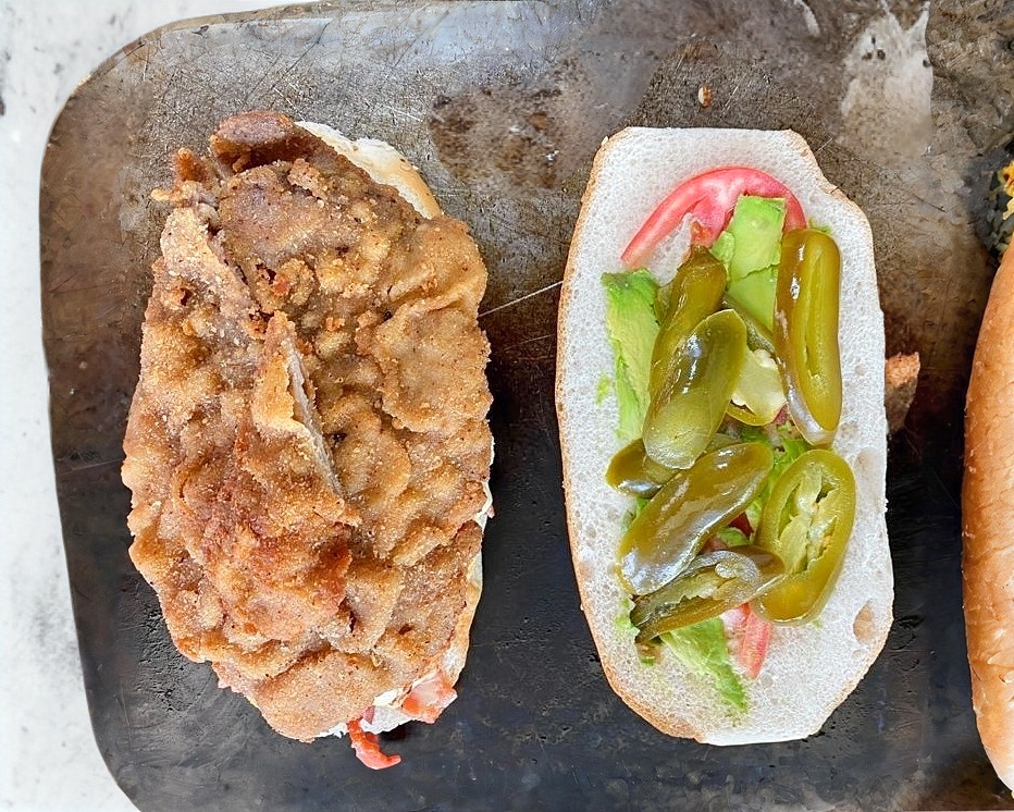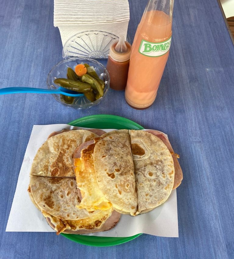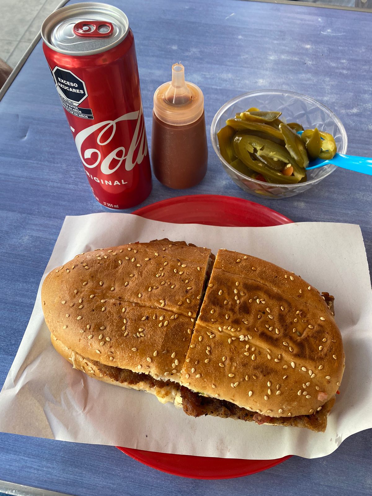 Milanesa, pierna, queso oaxaca. Plato personal y picante aparte.