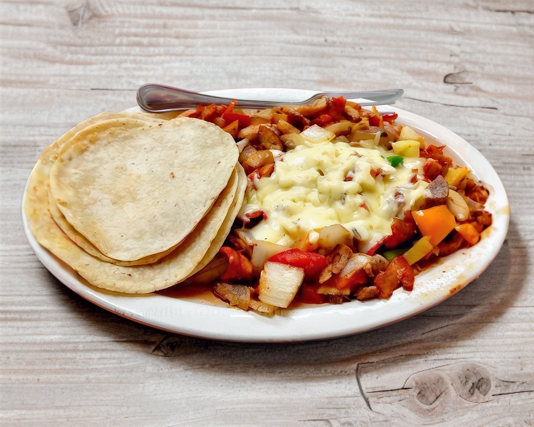Tortilla de harina súper grande con queso oaxaca y pastor.
