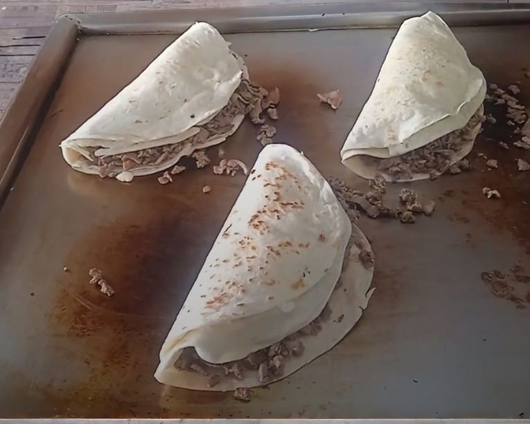Tortilla de harina súper grande, queso oaxaca y bistec.