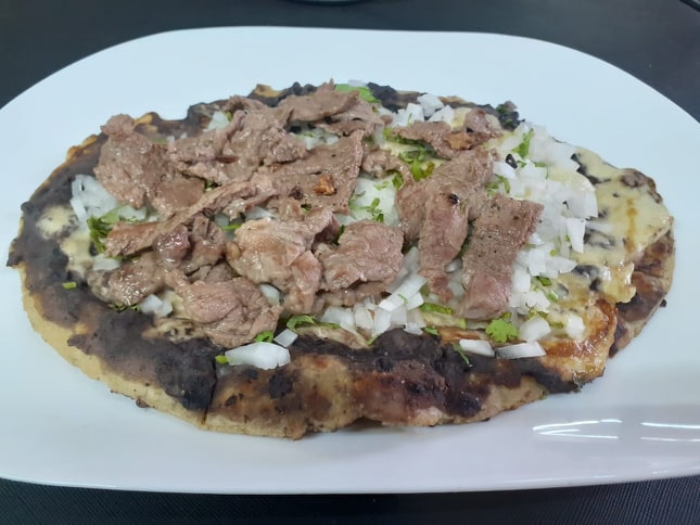 Carne al pastor queso rallado frijoles cebolla queso Oaxaca