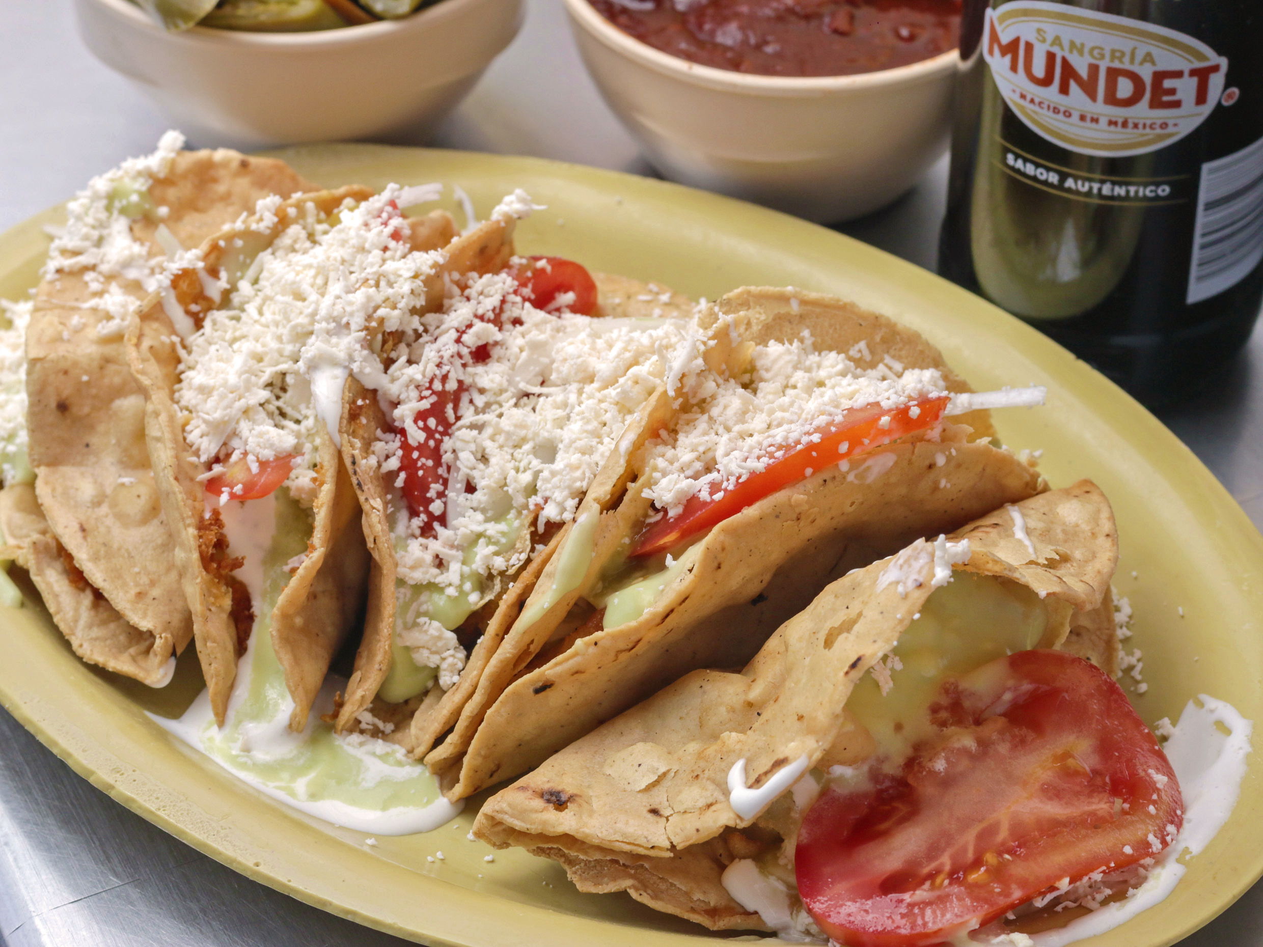 5 piezas con guacamole salsa jitomate cebolla crema y queso rayado