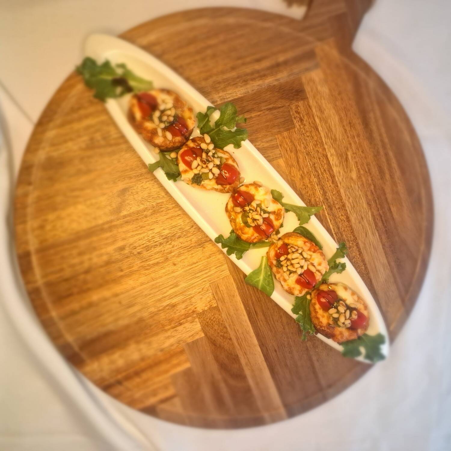 Rodajas de jitomate bola y mozzarella fresca, piñón blanco, con un toque de pesto, crema balsámica y aceite de oliva extra virgen.