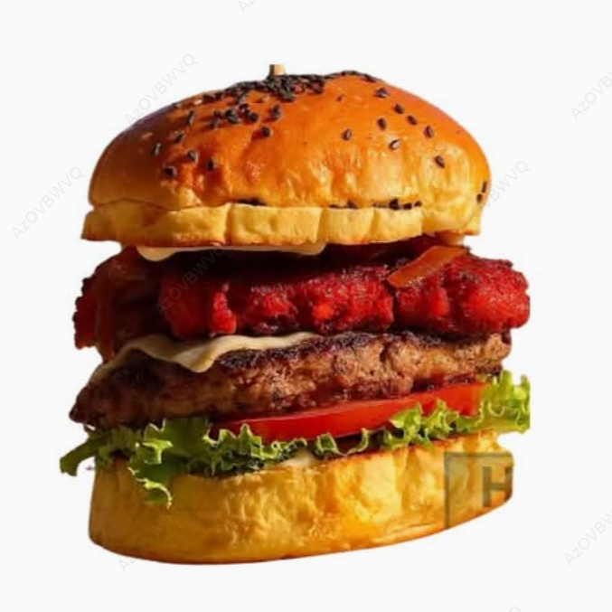 Burger especial con carne de res jugosa, chorizo frito, queso manchego, tocino crujiente y salsa picante de la casa, en pan brioche suave.