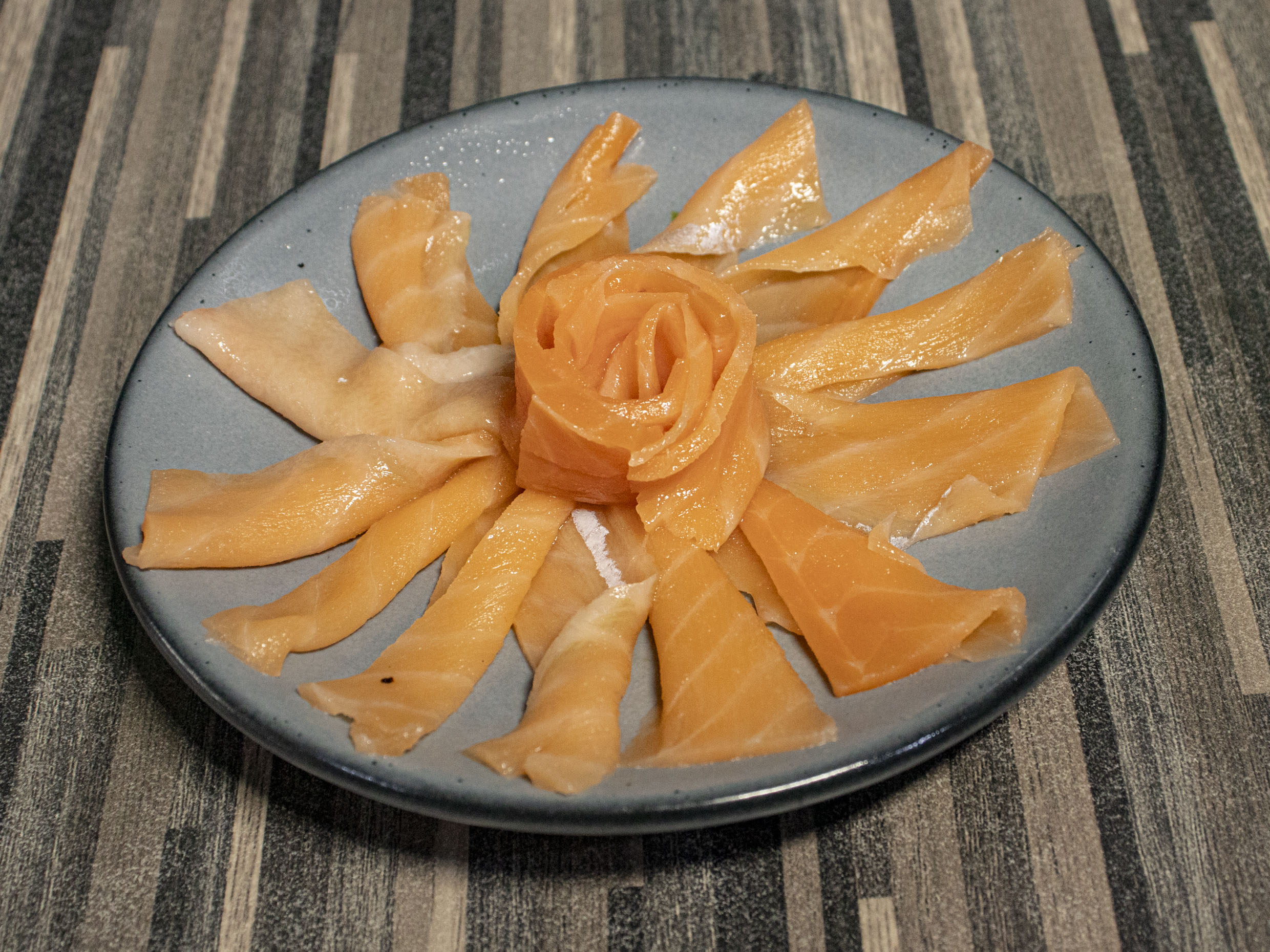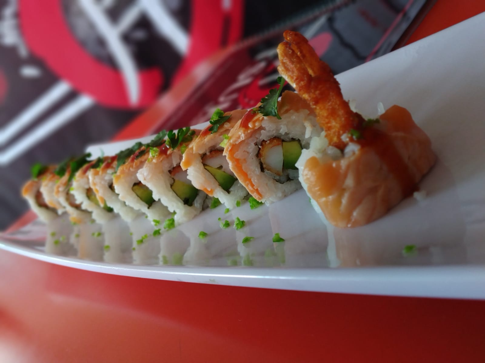 Por dentro camarón empanizado y aguacate, por fuera salmón sellado, habanero, cilantro y un toque de salsa spicy.