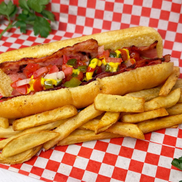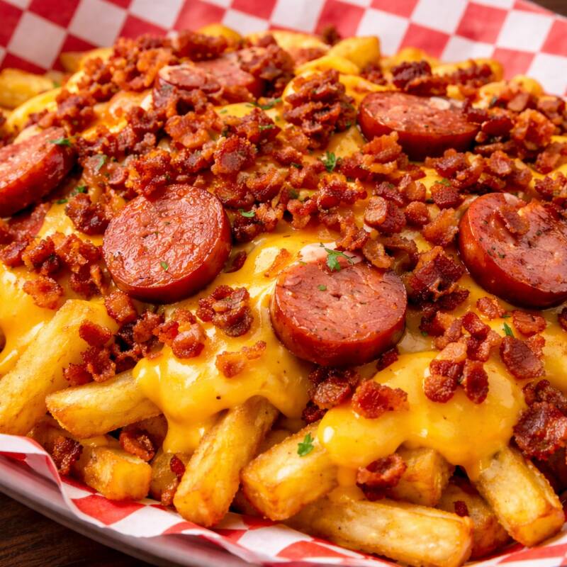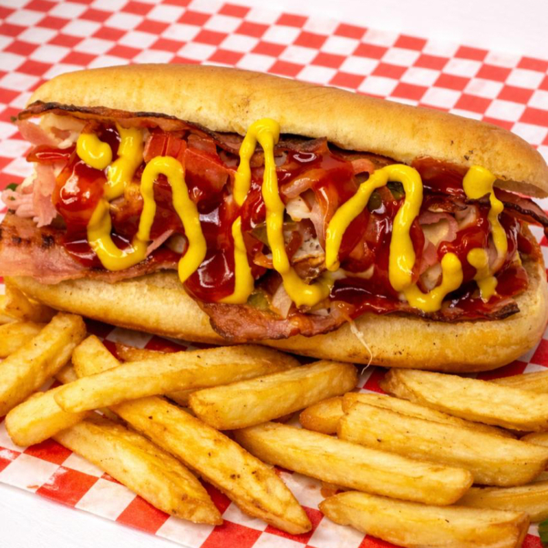 Carne de res (100 g), chorizo con queso Oaxaca, tocino, cebolla cocida, queso americano, lechuga, jitomate, mayonesa.