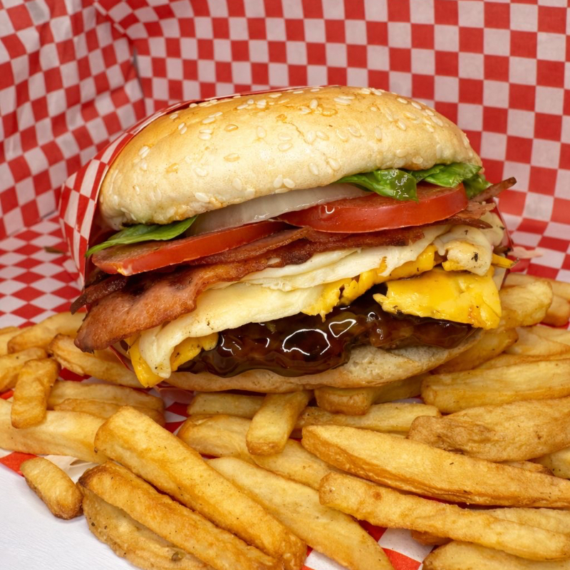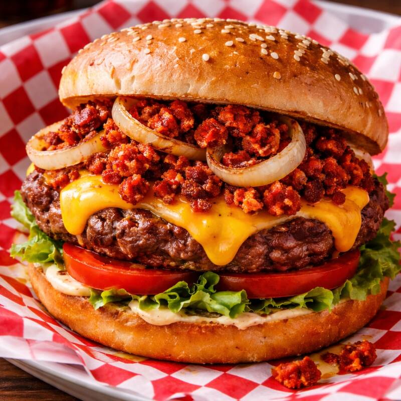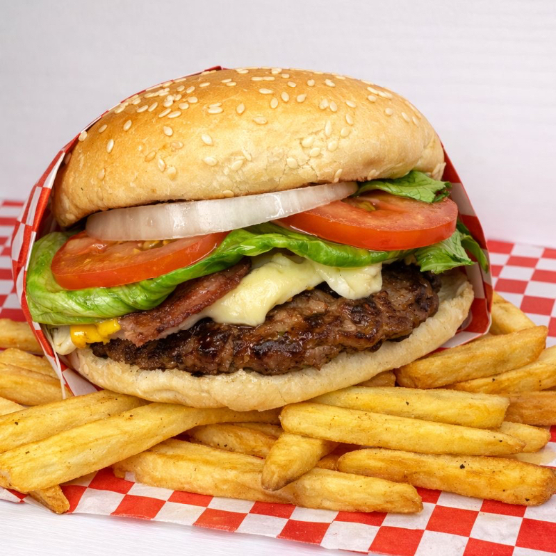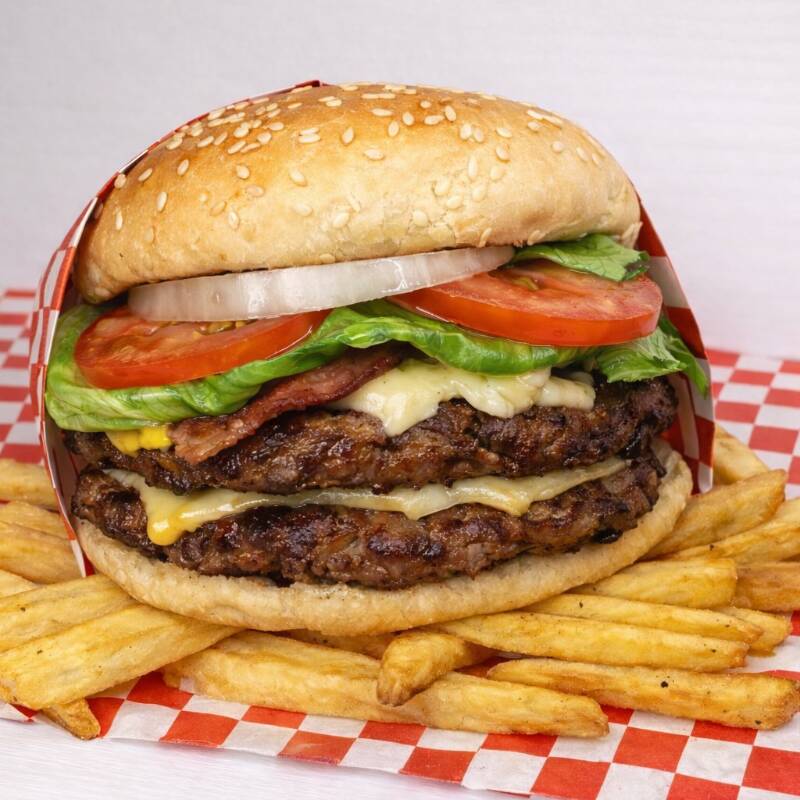 Doble carne de res (200 g), queso americano, queso Oaxaca, tocino, jamón, lechuga, jitomate, cebolla, mayonesa