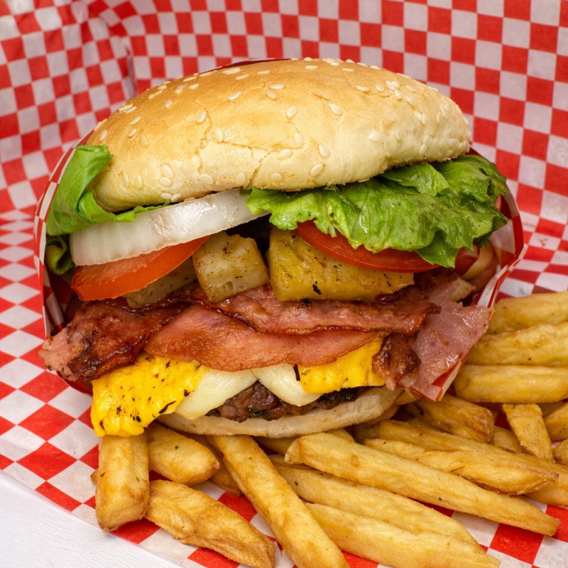Carne molida de res (100g), Bañada en salsa BBQ, Piña, Queso americano, Tocino, Jamón, Complementos