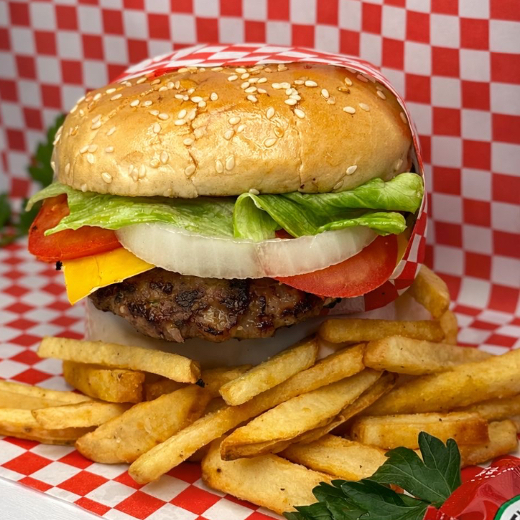 Carne molida de res (100g), Queso americano, Lechuga, Jitomate, Cebolla, Mayonesa