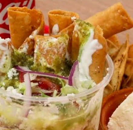 Tacos dorados de pollo, carne o papa con quesillo, bañados en tu elección de salsa, verde, chipotle o morita. Servidos en vaso, acompañados con queso, crema y lechuga, perfectos para cucharear o chopear a gusto, sabor callejero, presentación diferente.