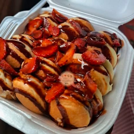 15 pzas De mini hot cakes de 2.5 cm de diámetro aproximadamente más 15 pzas de mini churros de 3 cm aproximadamente, servidos con 2 salsas dulces y 2 toppings a elegir.