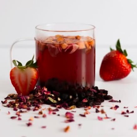 Tisana de pétalos de rosa, fresa, uva pasa y arándano.