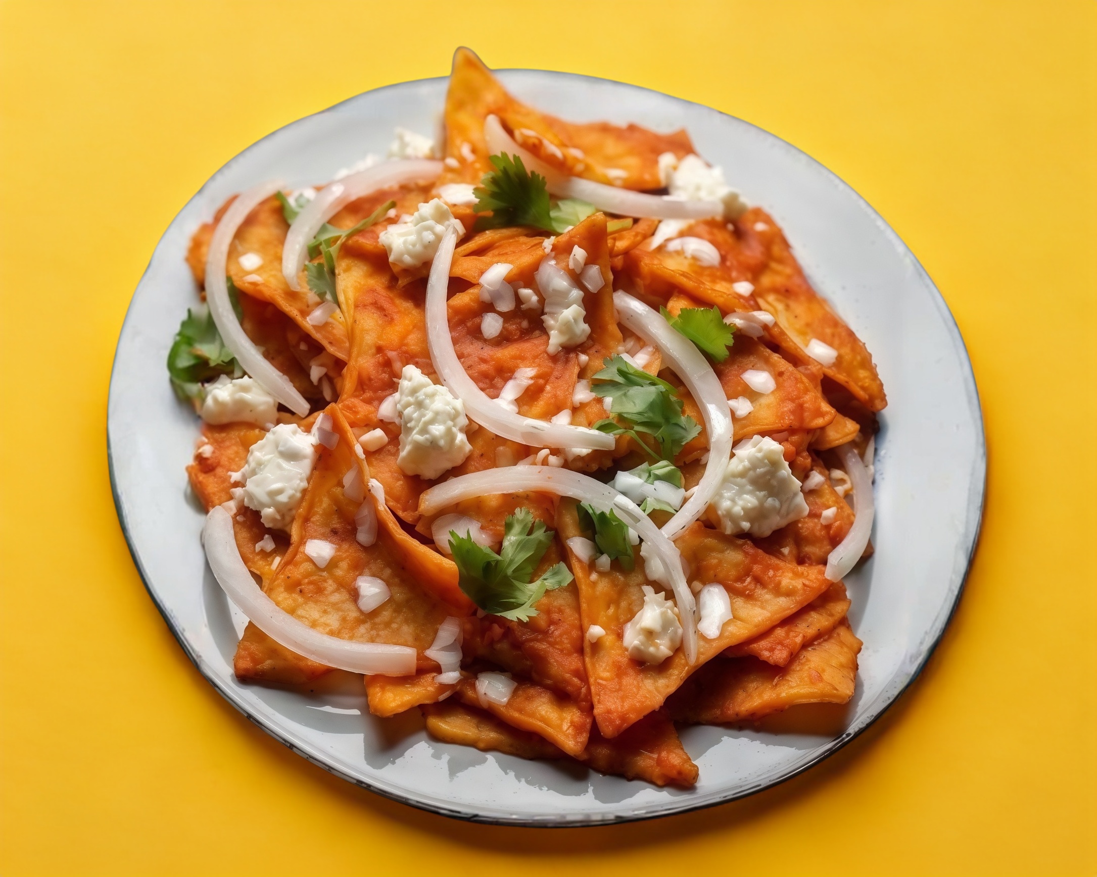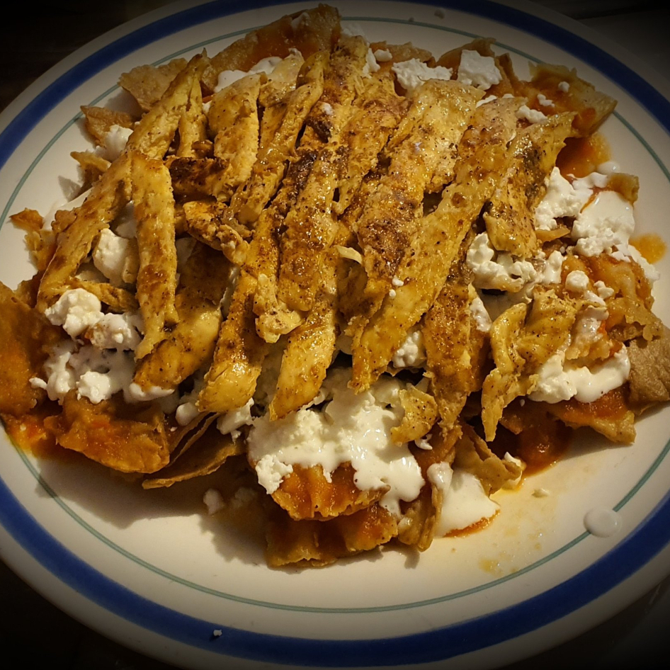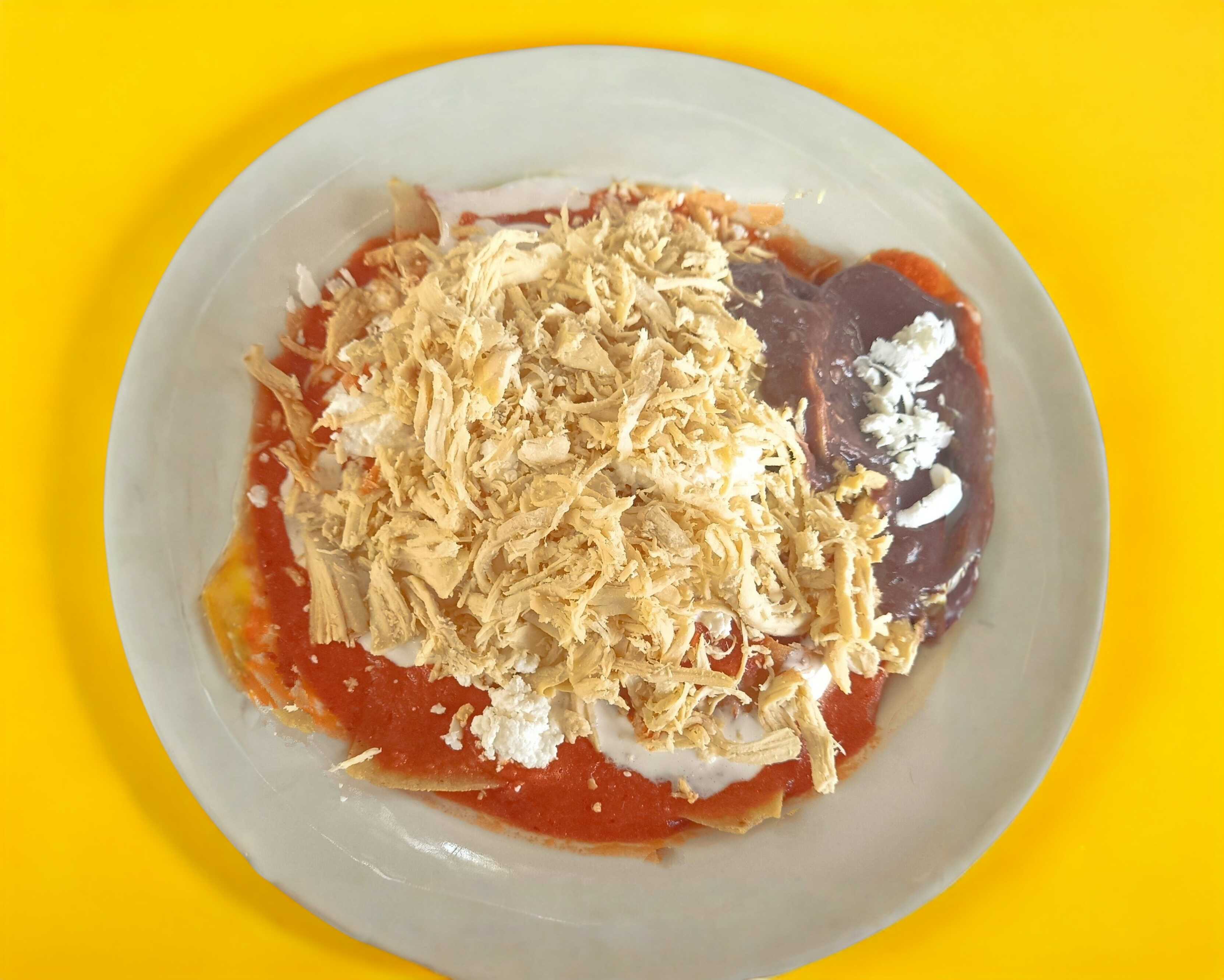 Totopos de maiz remojados en salsa a elegir, con pollo desmenuzado. Llevan crema y queso canasto.