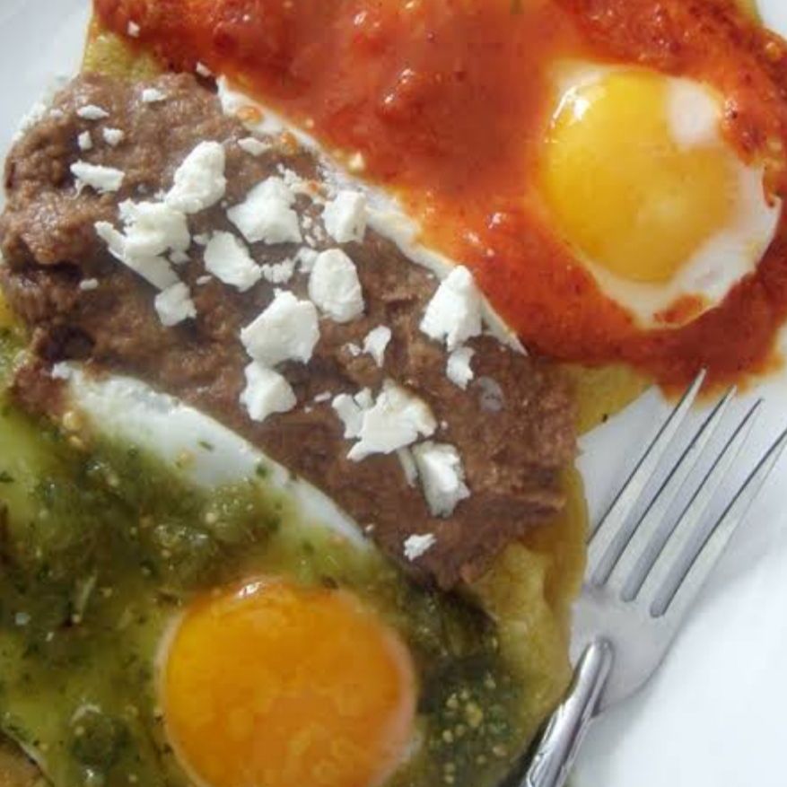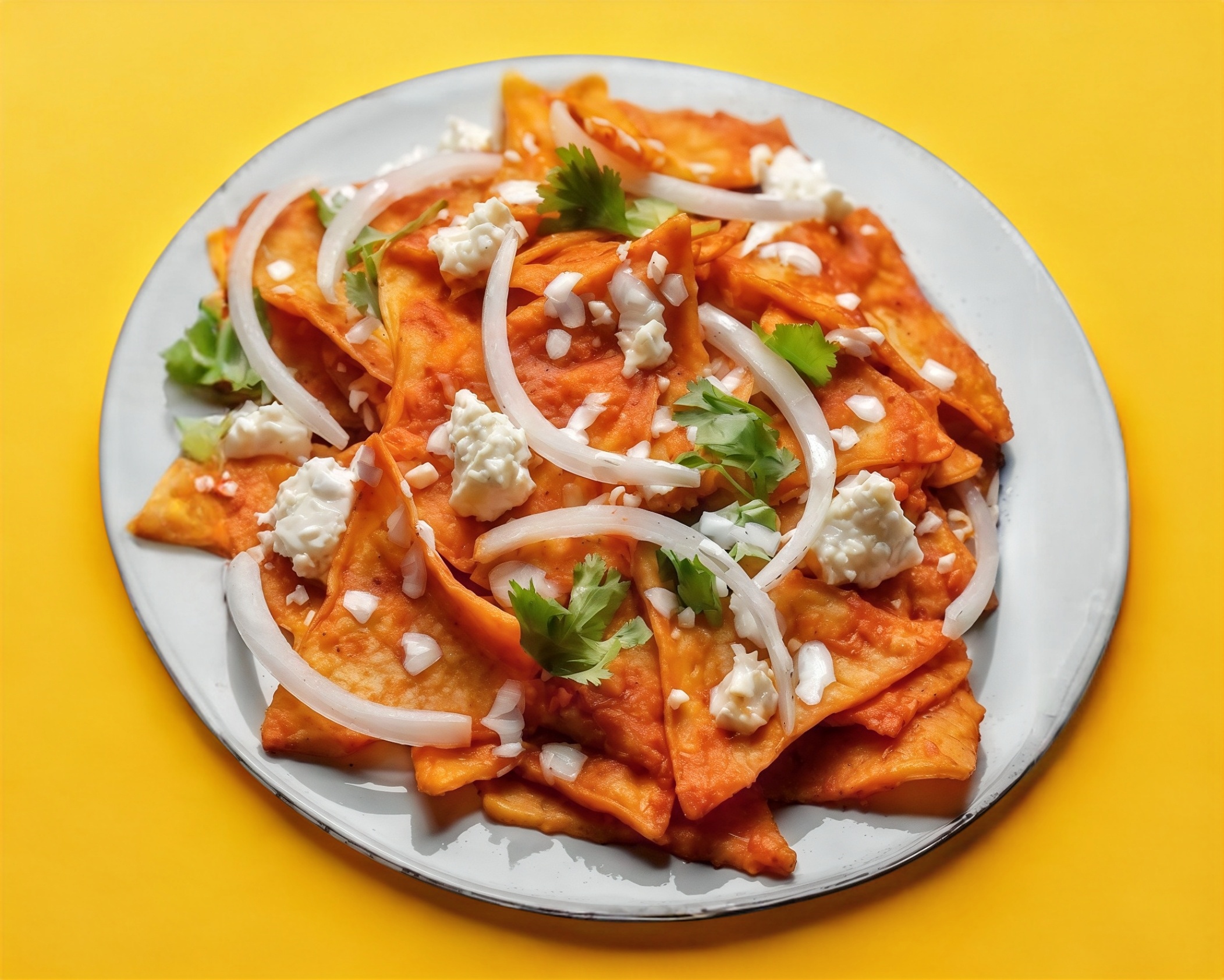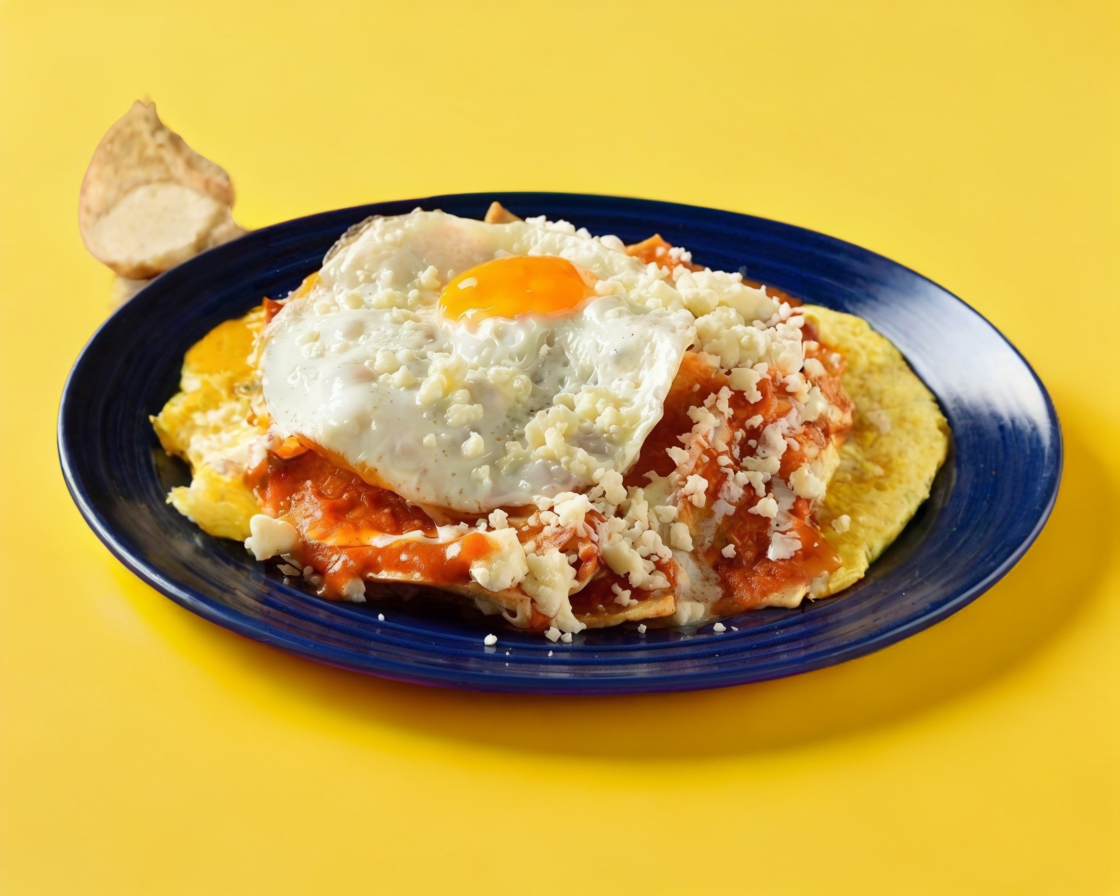 Totopos de maiz remojados en salsa a elegir, con pollo desmenuzado. Llevan crema y queso canasto.