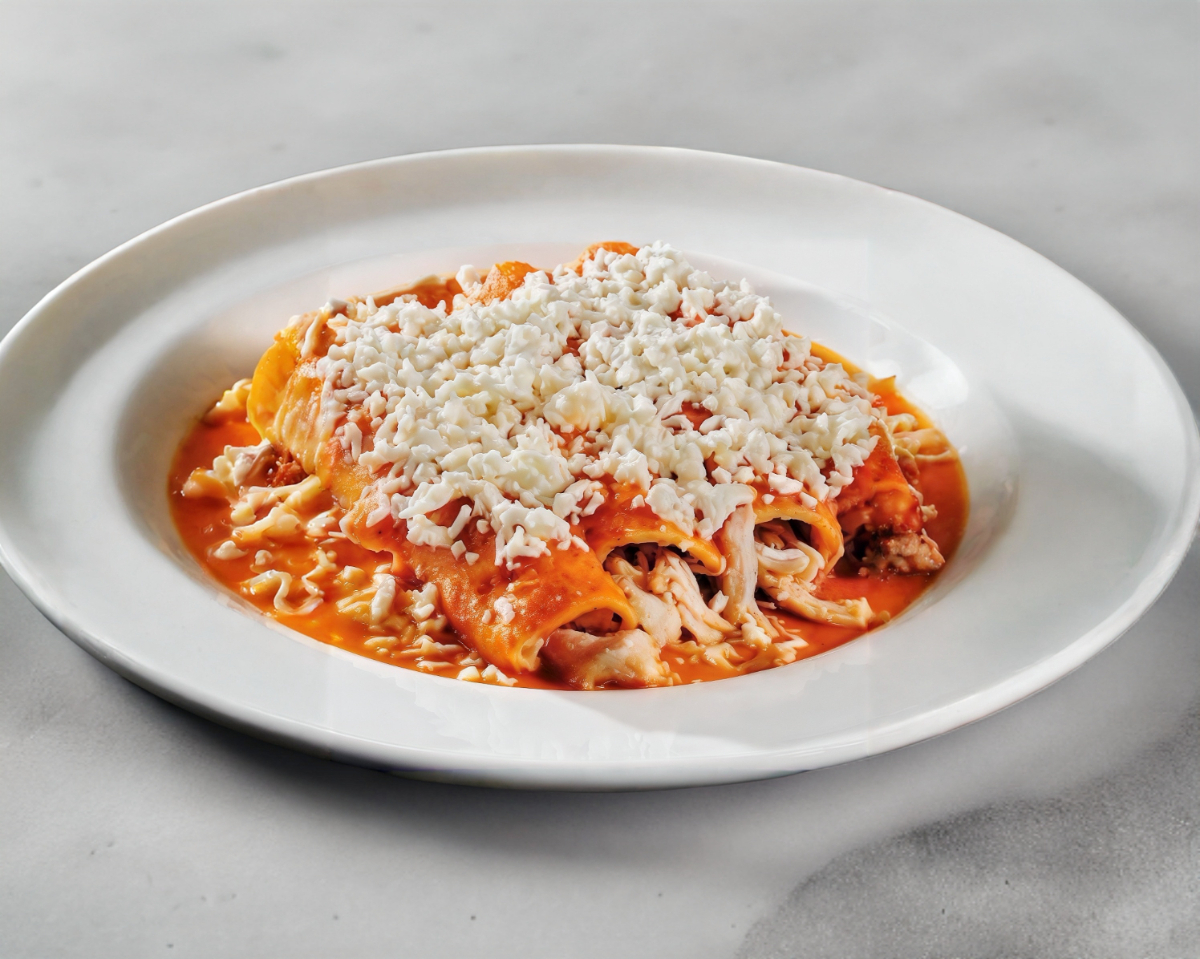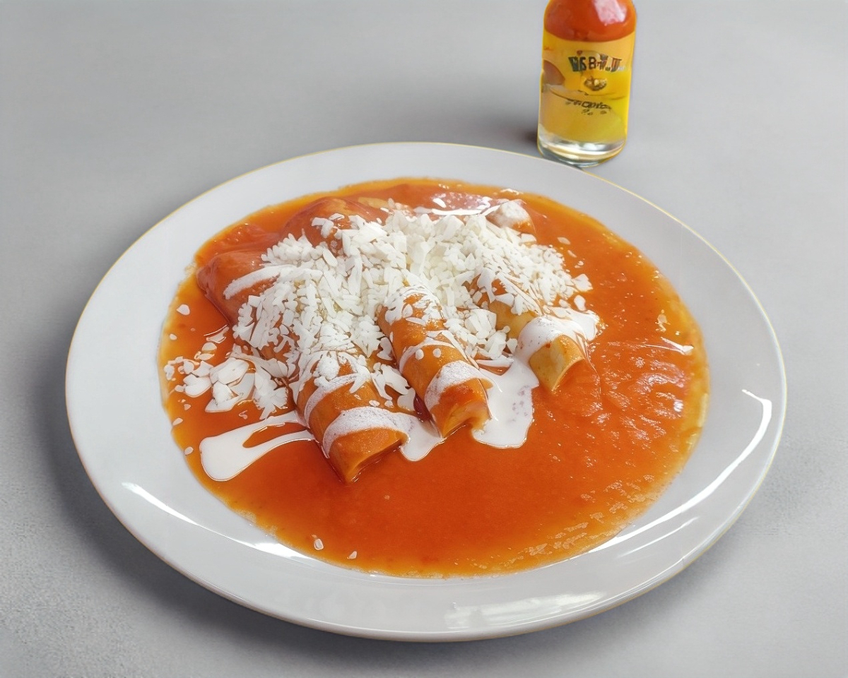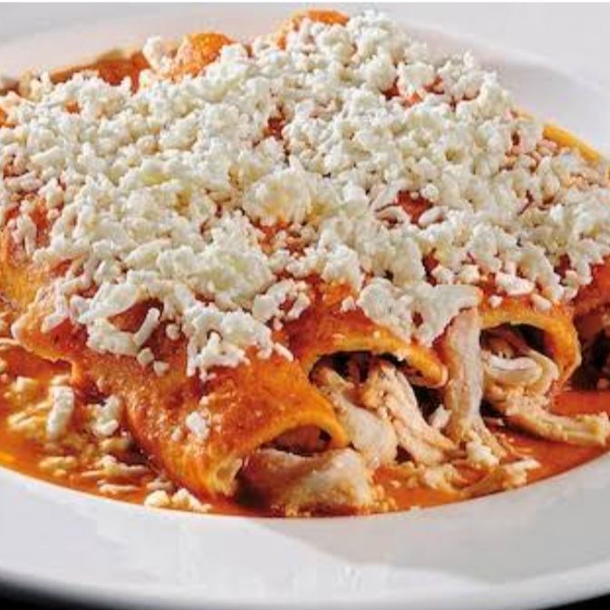 3 Piezas de tortilla relleno a elegir, se baña en salsa de su selección. Se sirve con crema y queso canasto