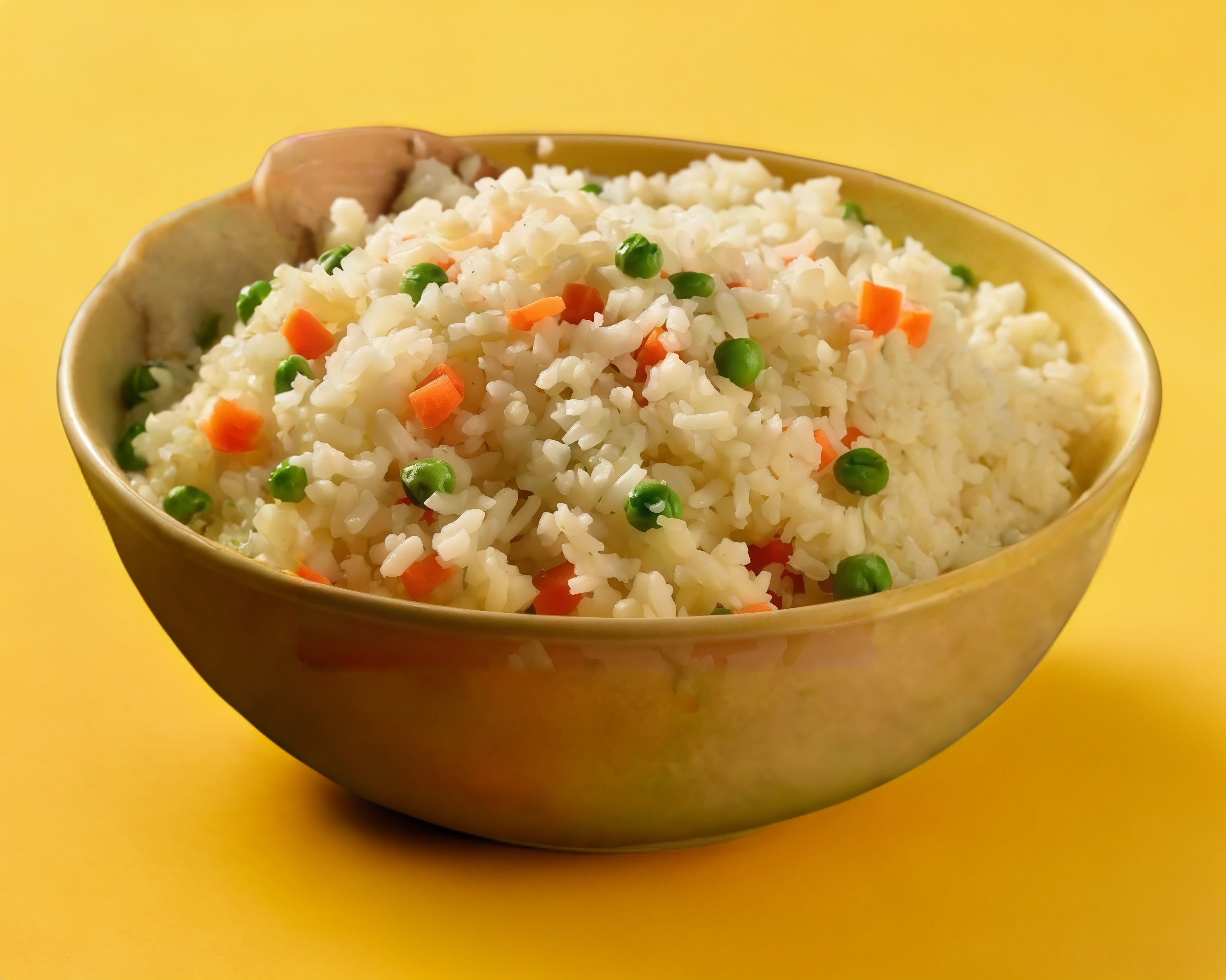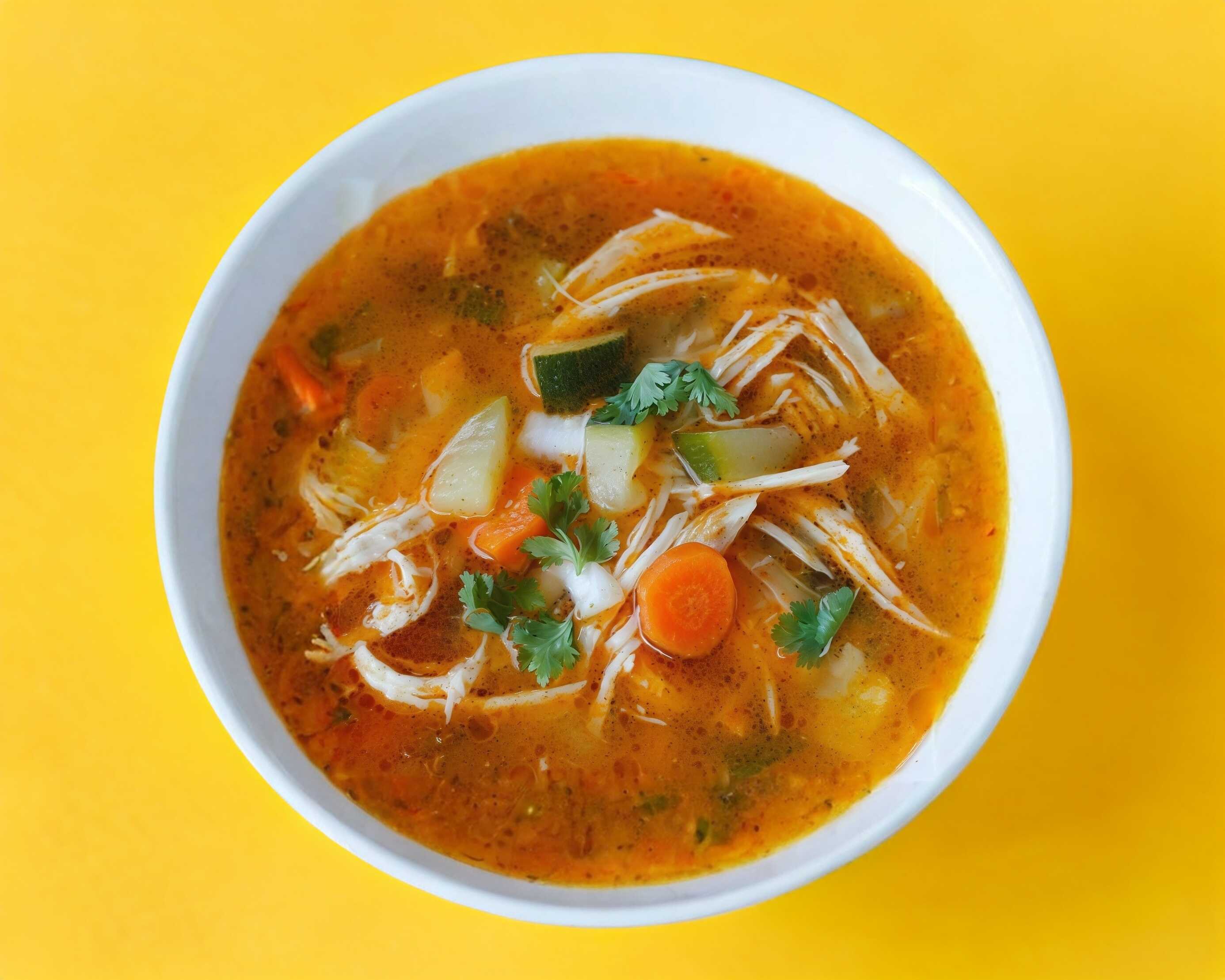 Medio litro de consomé con arroz, verdura y pollo desmenuzado