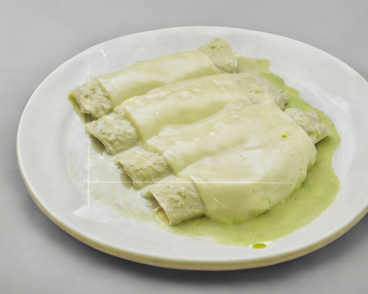 3pz tortillas de maíz, rellena de pollo bañado en salsa verde cremosa y gratinadas en queso.