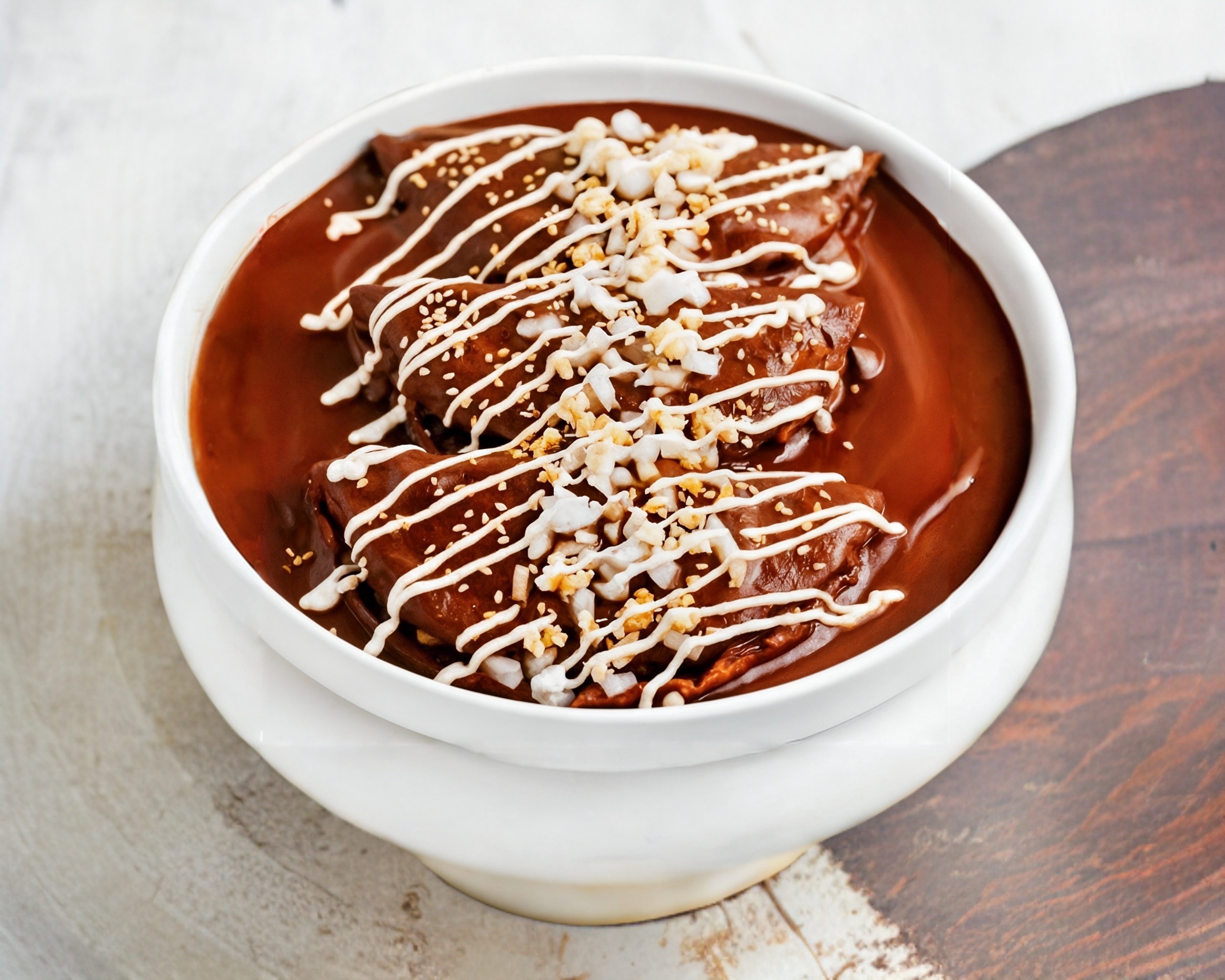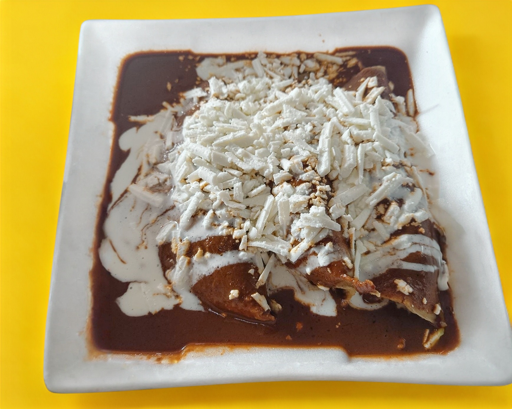 Tres piezas de enchiladas de pollo bañadas en salsa de mole rojo. Llevan crema y queso canasto.