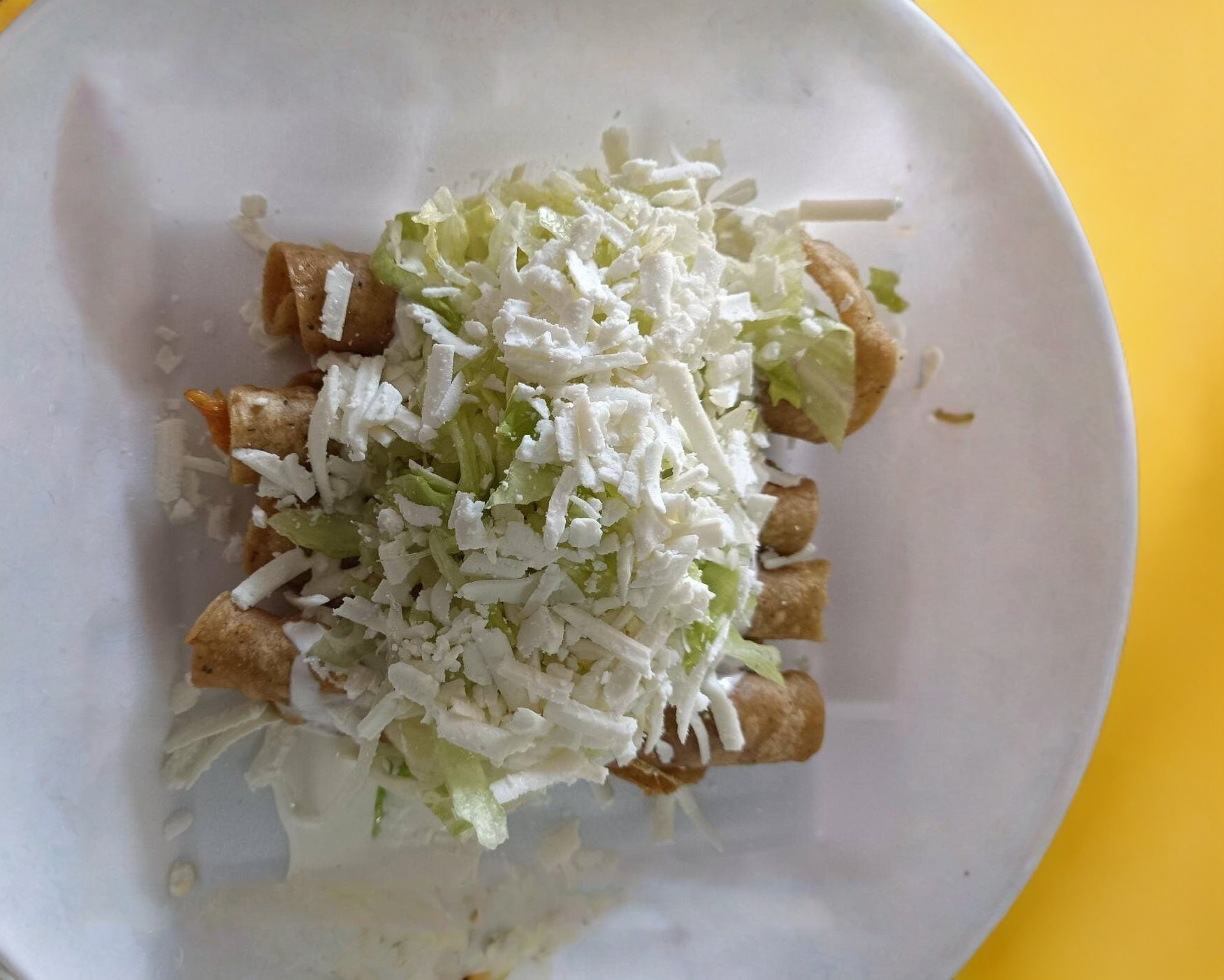 Tacos dorados de pollo, llevan crema, queso canasto y lechuga