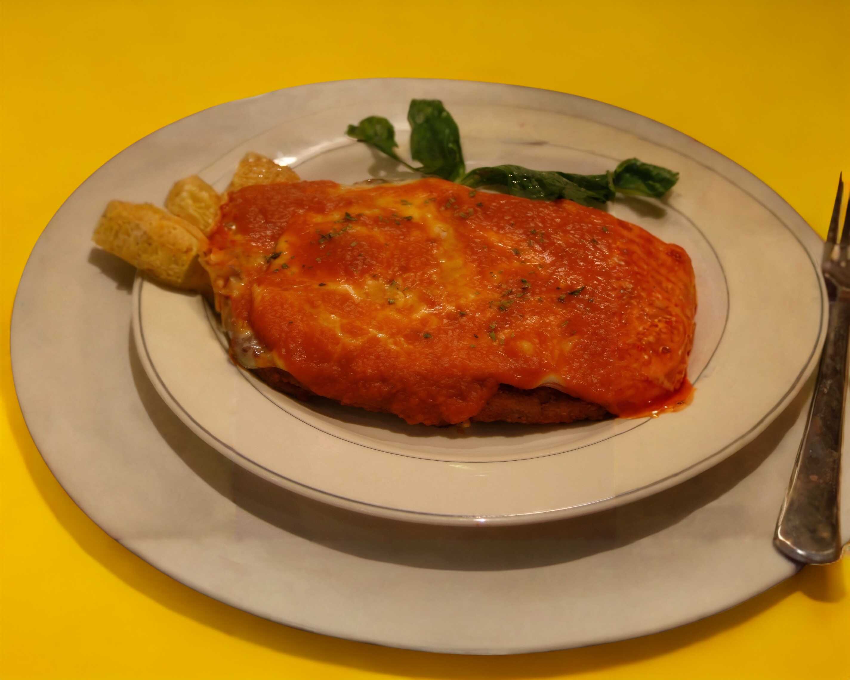 Pechuga de Pollo Empanizada Gratinada, Bañada en Salsa de Jitomate.