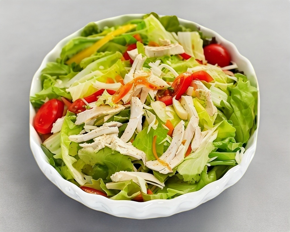 Pollo desmenuzado(140gr)+ Ensalada fresca con: lechugas mixtas, jícama, pepino, betabel, zanahoria y jitomate