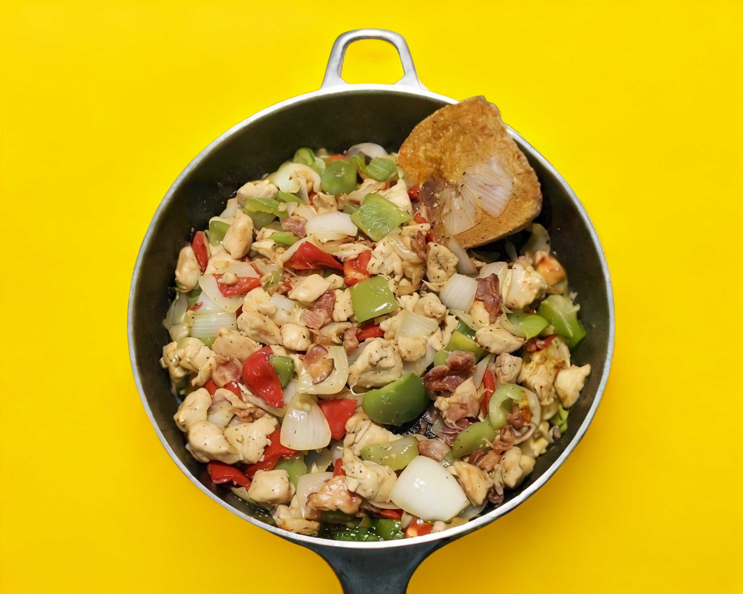Fajitas de pechuga pollo, pimiento morrón, cebolla y queso oaxaca