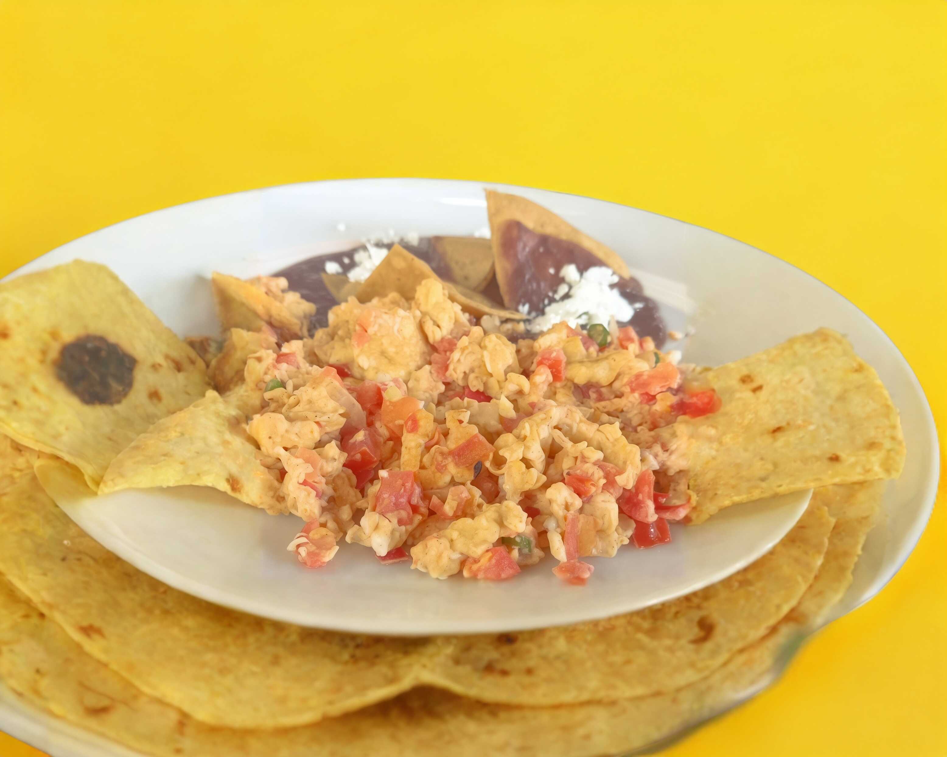 Huevos revueltos con frijol refrito y chipotle acompañado con totopos y salsa mexicana