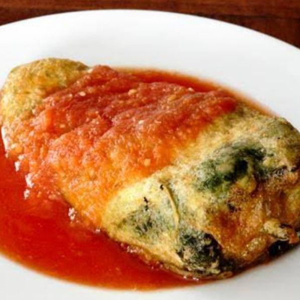 Chile capeado relleno de queso oaxaca, en caldillo de jitomate