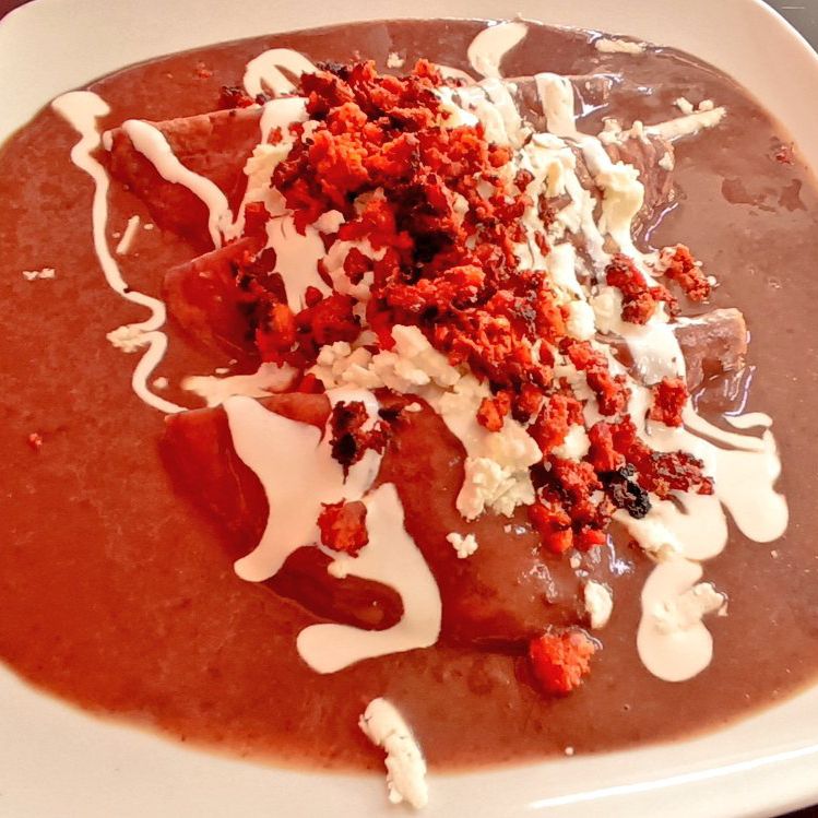 Enfrijoladas de huevo revuelto, bañadas en salsa de frijol con crema, queso y chorizo encima.