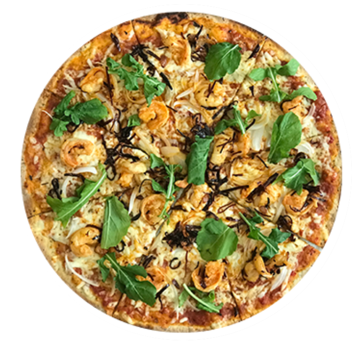 Pizza delgada de 40 cm. en horno de piedra con todo el sabor de la salsa de la casa, nuestra mezcla de quesos, camarones salteados con chile guajillo y ajo, acompañado de cebolla y arúgula
