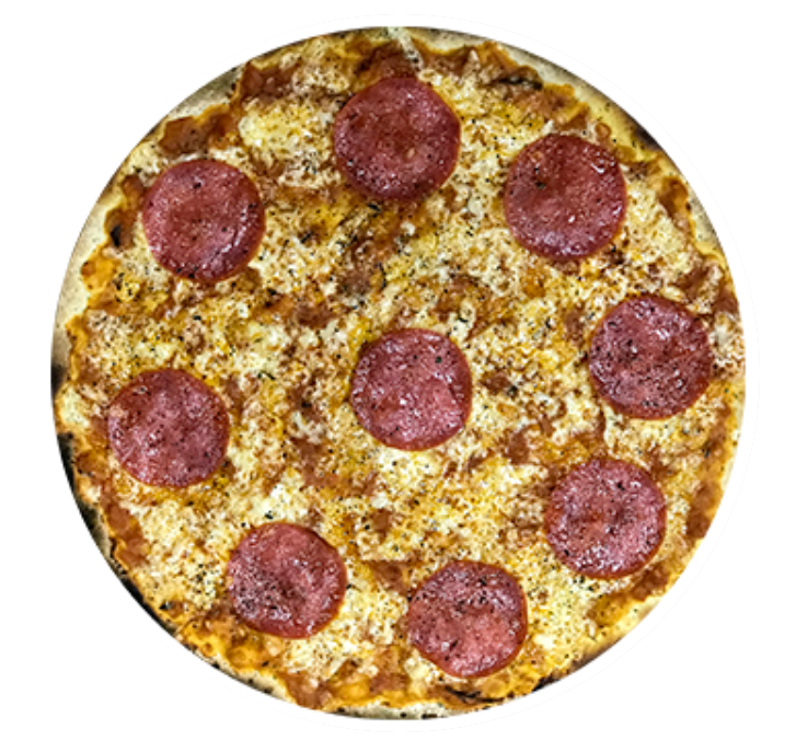 Pizza delgada de 40 cm. en horno de piedra con todo el sabor de la salsa de la casa, nuestra mezcla de quesos y salami