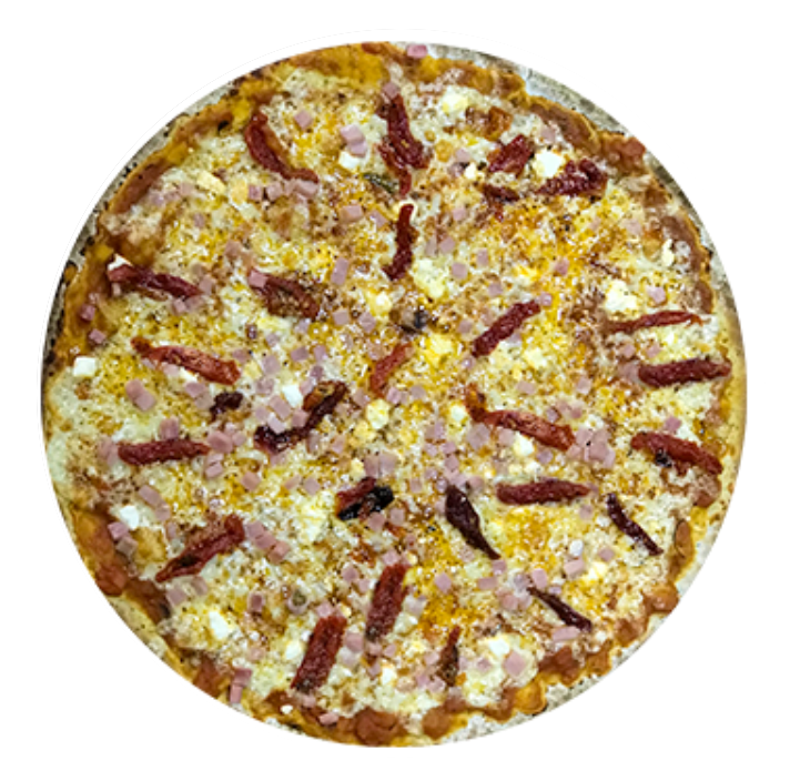 Pizza delgada de 40 cm. en horno de piedra con todo el sabor de la salsa de la casa, nuestra mezcla de quesos, jitomate deshidratado, queso crema y jamón de pierna