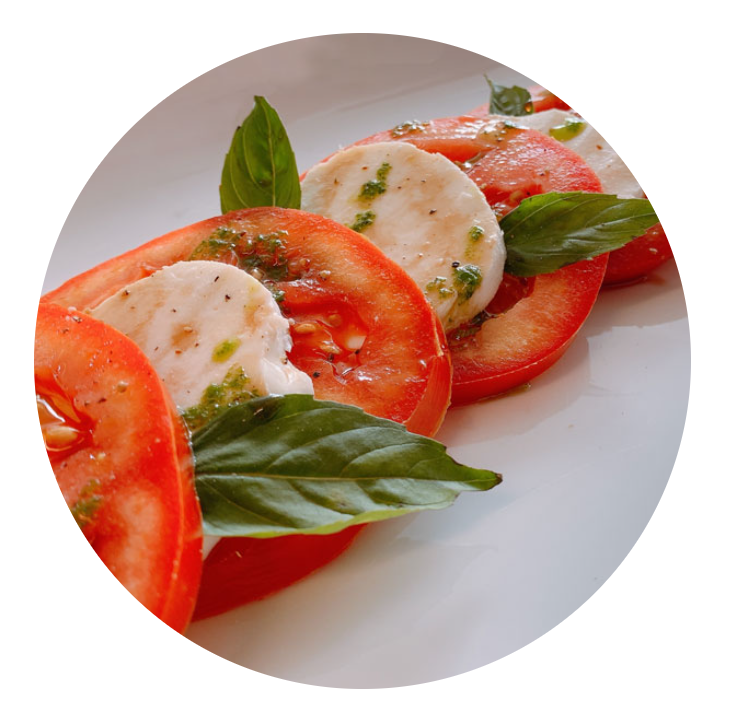 Rodajas de jitomate bola, rodajas de queso mozzarella fresco, nuestra original reducción de balsámico, pesto y hojas de albahaca