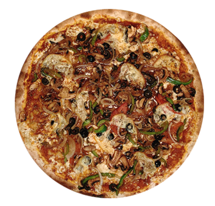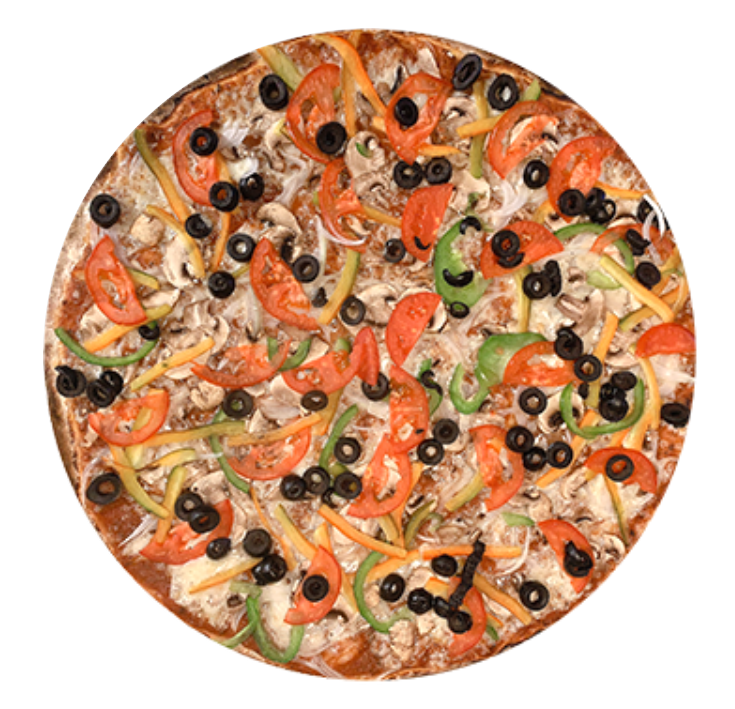 Pizza delgada de 40 cm. en horno de piedra con todo el sabor de la salsa de la casa, nuestra mezcla de quesos, rodajas de queso provolone con vegetales salteados (champiñón, rodajas de jitomate, aceituna negra, cebolla y pimiento verde)