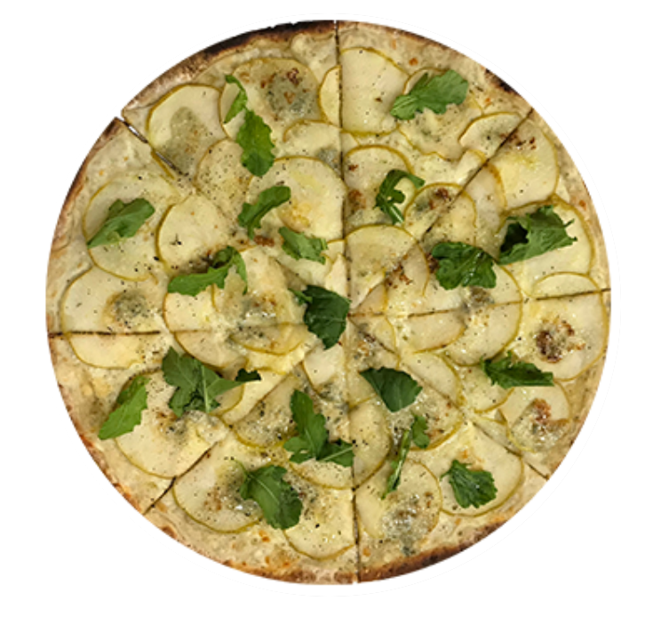 Pizza delgada de 40 cm. en horno de piedra con salsa blanca de la casa, queso Gorgonzola y pera