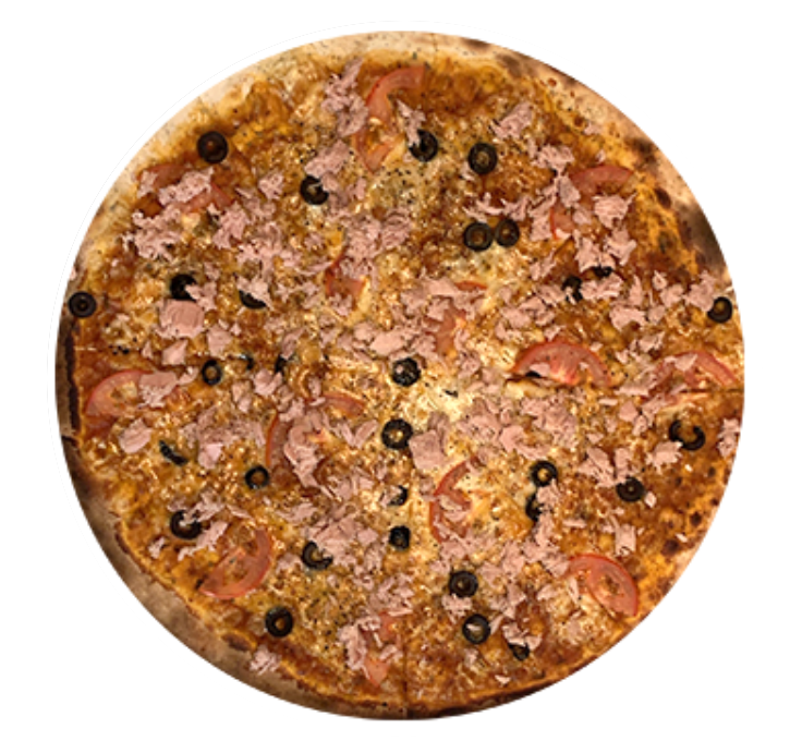 Pizza delgada de 40 cm. en horno de piedra con todo el sabor de la salsa de la casa, nuestra mezcla de quesos, atún, rodajas de jitomate y aceituna negra