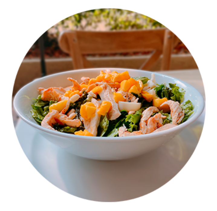 Lechuga, palmito, trozos de mango, cacahuate en trozos, pollo y vinagreta dulce de cilantro