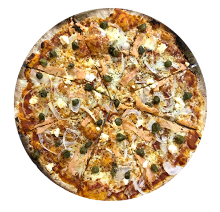 Pizza delgada de 40 cm. en horno de piedra con todo el sabor de la salsa de la casa, nuestra mezcla de quesos, salmón ahumado, acompañado de alcaparra, cebolla y queso crema