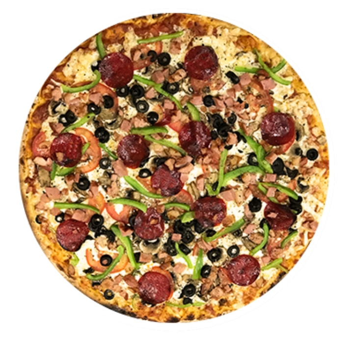 Pizza delgada de 40 cm. en horno de piedra con todo el sabor de la salsa de la casa, nuestra mezcla de quesos, pepperoni, tocino, champiñón, rodajas de jitomate, aceituna negra, cebolla y pimiento verde