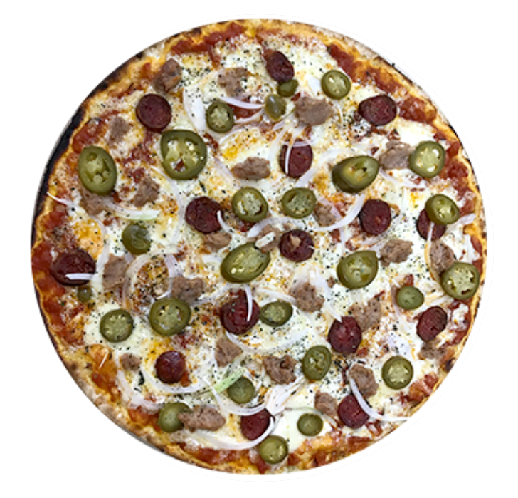 Pizza delgada de 40 cm. en horno de piedra con todo el sabor de la salsa de la casa, nuestra mezcla de quesos, frijoles refritos, cebolla, chorizo casero y chile jalapeño