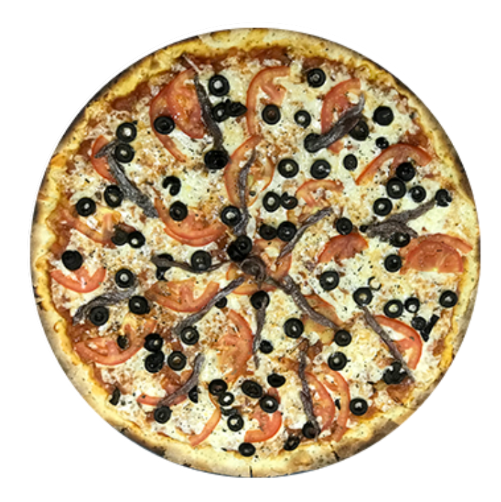 Pizza delgada de 40 cm. en horno de piedra con todo el sabor de la salsa de la casa, nuestra mezcla de quesos, anchoas, rodajas de jitomate y aceituna negra