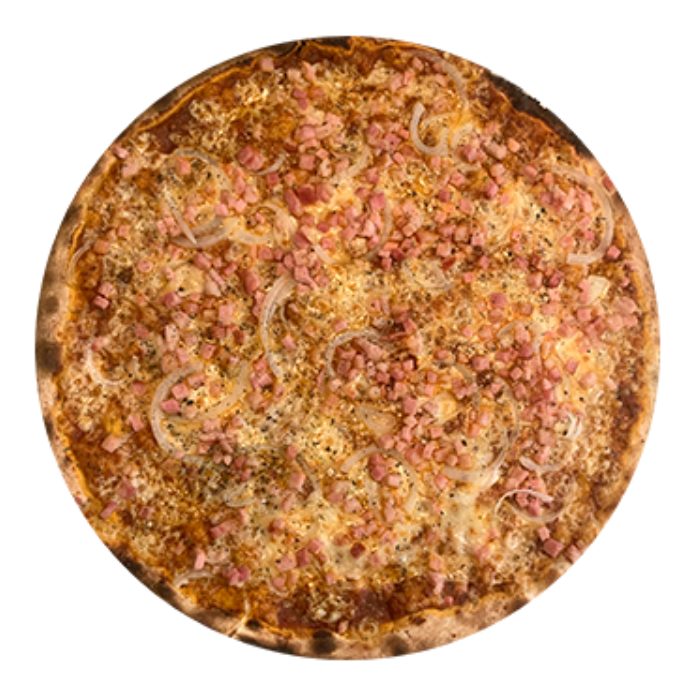 Pizza delgada de 40 cm. en horno de piedra con todo el sabor de la salsa de la casa, nuestra mezcla de quesos, tocino ahumado precocido y cebolla