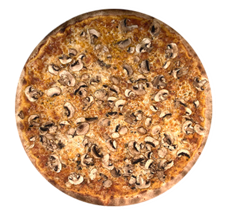 Pizza delgada de 40 cm. en horno de piedra con todo el sabor de la salsa de la casa, nuestra mezcla de quesos y champiñones.
